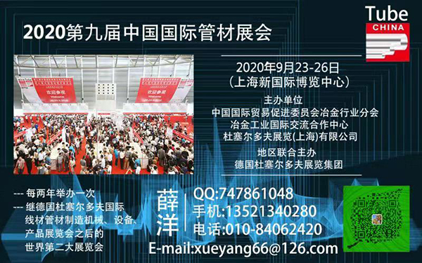 广发英雄帖!!一纸英雄帖,激起千层浪!全球管材行业最具影响力的两大展会”之一!国际上规模最大“杜塞尔多夫管材展览会”的“中国版”——中国国际管材展览会(Tube China 2020),再次重装于2020年9月23-26日在上海新国际博览中心亮相,这是一个为满足中国市场最新需求而度身定做的展览。由中国贸促会冶金行业分会和杜塞尔多夫展览集团有限公司共同主办。中国国际管材展览会(Tube China)得到了中国钢铁工业协会等国内相关行业协会的支持!同时也得到了国际管业协会(ITA)和德国杜塞尔多夫展览机构及该机构主办的世界最大管材展(Tube Dusseldorf)的全力支持!无与伦比的地位受到展商与观众的一致肯定。