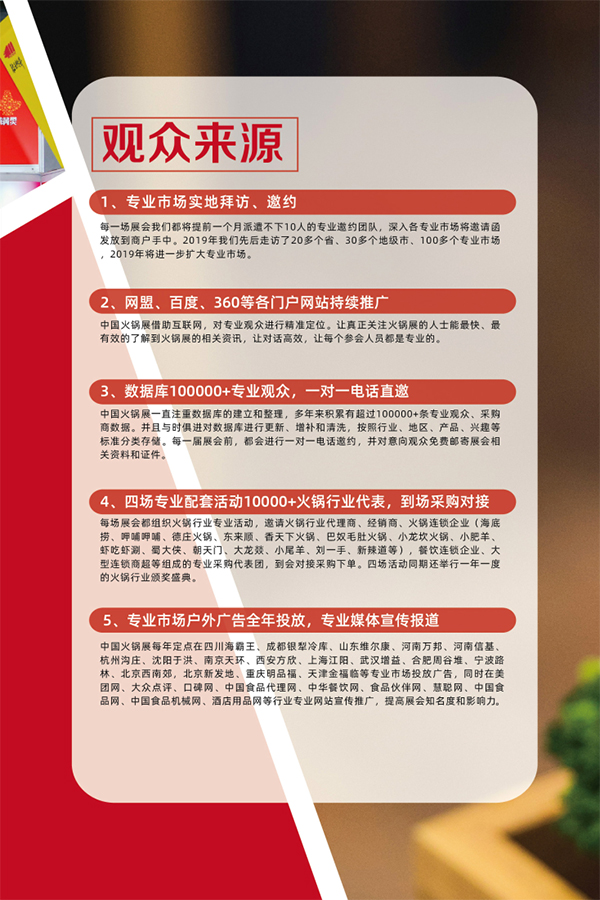 中国火锅展以弘扬火锅美食文化、提升行业整体形象、打造火锅美食名片、积极促进火锅产业化、规模化、标准化发展为活动宗旨,以北京、郑州、成都为基点整合各方力量和优势,以全新的经营理念和优质服务,把展会打造成一个集招商引资、技术合作、产品推广、品牌打造、学术交流的平台,构建具有相当影响力的火锅行业盛会。预计2020年展会总面积达85000平方米,将有来自全国各地近千家企业携同800个中高端品牌参展,预计全年专业采购人次达到100000人次。