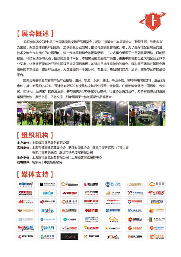 欢迎参加2020第七届广州国际锁具安防产品展览会,简称“锁博会”本届展会以‘智能生活、锁定未来’为主题,聚焦全球锁具产品创新、加快锁具行业发展,推动传统锁具智能化升级,为了更好地配合展会交易、技术交流合作与推广的办展目的,进一步丰富广州锁博会的配套活动,主办方精心组织了一系列重要活动,以前沿视角、科技驱动为切入点,搭建交流合作平台,本届展会的全面推广策略,更由中国辐射至亚太地区及全球专业买家,让展商更能有效开拓中国以至海外国际市场,加强与目标买家接洽的机会。辉科展览凭借在国际会展组织的丰富经验,整合产业资源,为企业提供一个国际化、专业化、高品质的交流、洽谈、交易与合作的平台。