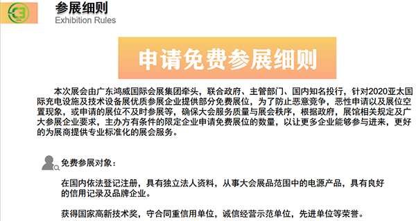 为了响应《国务院办公厅关于加快新能源汽车推广应用 的指导意见》、《国务院办公厅关于加快电动汽车充电基础设 施建设的指导意见》,大力推进充电基础设施建设,促进电动汽 车产业发展和电力消费,由国家节能中心指导、广东省节能协 会、广东省粤港澳合作促进会支持联合举办的“2020亚太国际充电设施及技术设备展”,在广州·中国进出口商品交易会展馆 举办,本次大会以充电产品整机、储能技术和相关配套解决方 案及连接装配作为主题,汇聚了充电设备和储能技术产业上下 游企300多家,展示新科技,共同探讨行业发展之路。 为此,广东鸿威国际会展集团紧抓市场与政策,积极举办 2020亚太国际充电设施及技术设备展,为行业及产业链搭建一 个国际性的交流贸易平台。