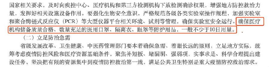 其中提到,确保医疗机构储备质量合格、数量充足的医用口罩、隔离衣、眼罩等防护用品,一般不少于10日用量。同时要求每个城市改扩建1-2所现有医疗机构。