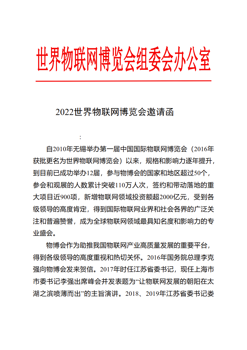 诚邀贵方参加2022世界物联网博览会展示,共同见证国内国际物联网产业的成长与辉煌!