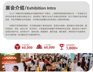 2022广州餐饮供应链展是上海博华国际展览有限公司和广东省食文化研究会名厨专业委员会联合主办,展会整合了餐饮行业全产业链的优势资源,致力于推动行业的快速发展、开拓华南餐饮业市场蓝海,为华南及全国餐饮业的发展注入强劲的新动能。