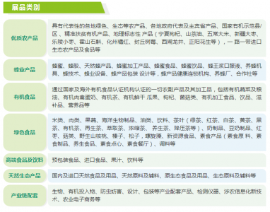 一、优质农产品具有代表性的各地绿色、生态等农产品、各地政府代表及主宾省产品、国家有机示范县/区 、精准扶贫有机产品、地理标志性产品(宁夏枸杞、山茶油、五常大米、新疆大枣、乐陵小枣、霍山石斛、化州橘红、封丘树莓、西湖龙井、正阳花生等),一