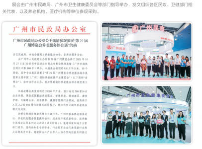 2、市民政、市卫生健康委指导:展会由广州市民政局、广州市卫生健康委员会等部门指导举办,发文组织各区民政、卫健部门相关代表,以及养老机构、医疗机构等单位参观采购。