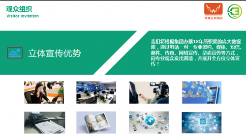 我们将根据集团办展18年所积累的庞大数据 库,通过电话一对一专业邀约、媒体、短信、 邮件、传真、网络宣传、杂志宣传等方式, 向专业观众发出邀请,并展开全方位立体宣 传!