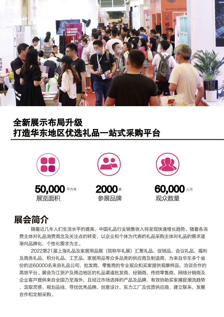 2022第21届上海礼品展将汇聚礼品、促销品、会议礼品、福利及商务礼品、积分礼品、工艺品、家居用品等众多品类的供应商及制造商,为来自华东多个省份的近60000名来自礼品公司、批发商、零售商的专业观众和买家提供观摩样品、洽谈合作的高效平台。展会为江浙沪及周边地区的礼品渠道批发商、经销商、传统零售商、网络分销商及企业客户提供来自全国乃至海外、且经过市场选择的产品及品牌,有效协助买家捕捉潮流趋势,汲取灵感,规划品线,寻找优秀品牌、创意设计、实力工厂及优质供应商,建立联系、发展合作和定制采购。
