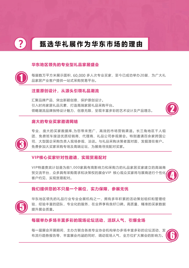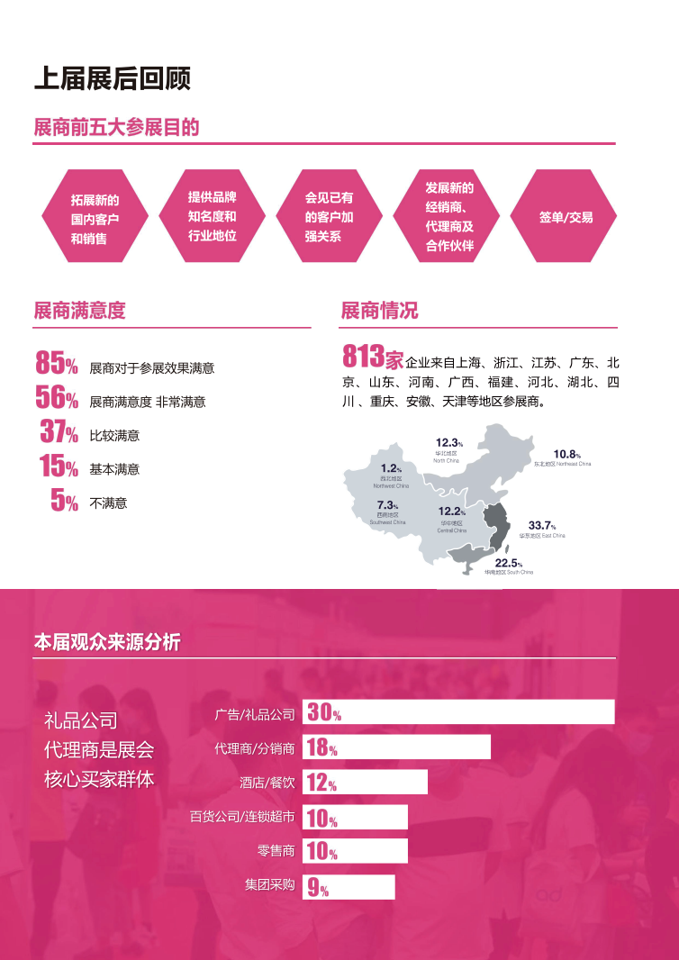 作为华东地区较早的礼品产业专业会展机构之一,拥有多年积累的活动策划组织和管理经验,经验丰富的团队,专业化的服务,努力为展商提供高质量、精准的买家数据提升展会质量。