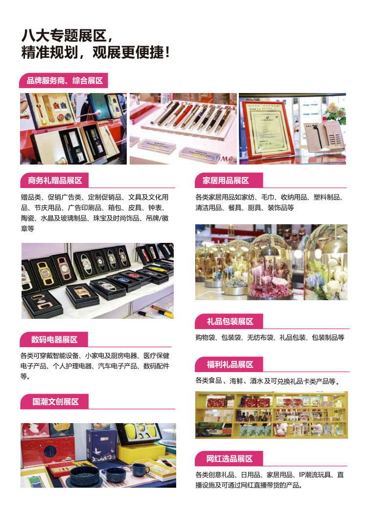 赠品类、促销广告类、定制促销品、文具及文化用品、节庆用品、广告印刷品、箱包、皮具、钟表、陶瓷、水晶及玻璃制品、珠宝及时尚饰品、吊牌/徽章等