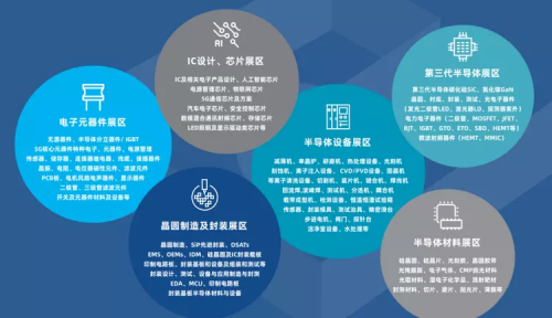 五、晶圆制造及封装展区:晶圆制造、SiP先进封装、OSATs、EMS、OEMs、IDM、硅晶圆及IC封装载板、印制电路板、封装基板和设备及组装和测试等、封装设计、测试、设备与应用制造与封测、EDA、MCU、印制电路板、封装基板半导体材料与设备