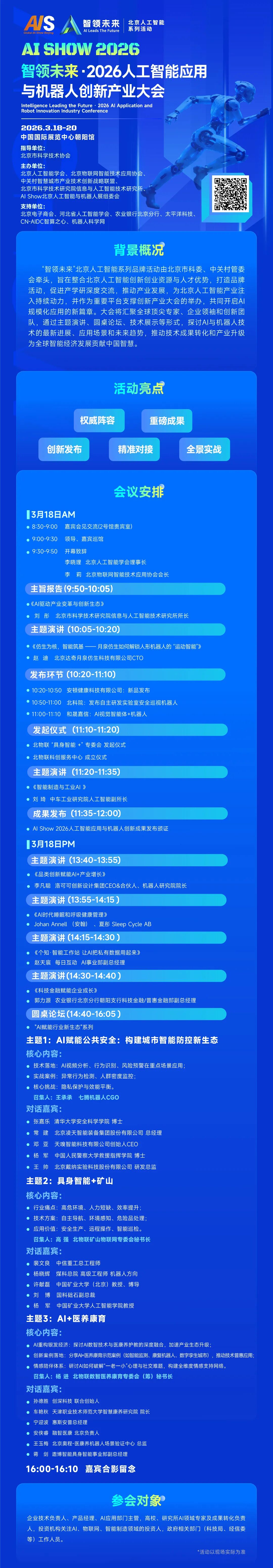 内容摘要: 展会概况 名称:AI Show 2026北京国际人工智能应用与机器人创新博览会 时间: 3月18日:9:00-17:00 3月19日:9:00-17:00 3月20日:9:00-15:00 地点:中国国际展览中心(朝阳馆) 免费门票领取流程……