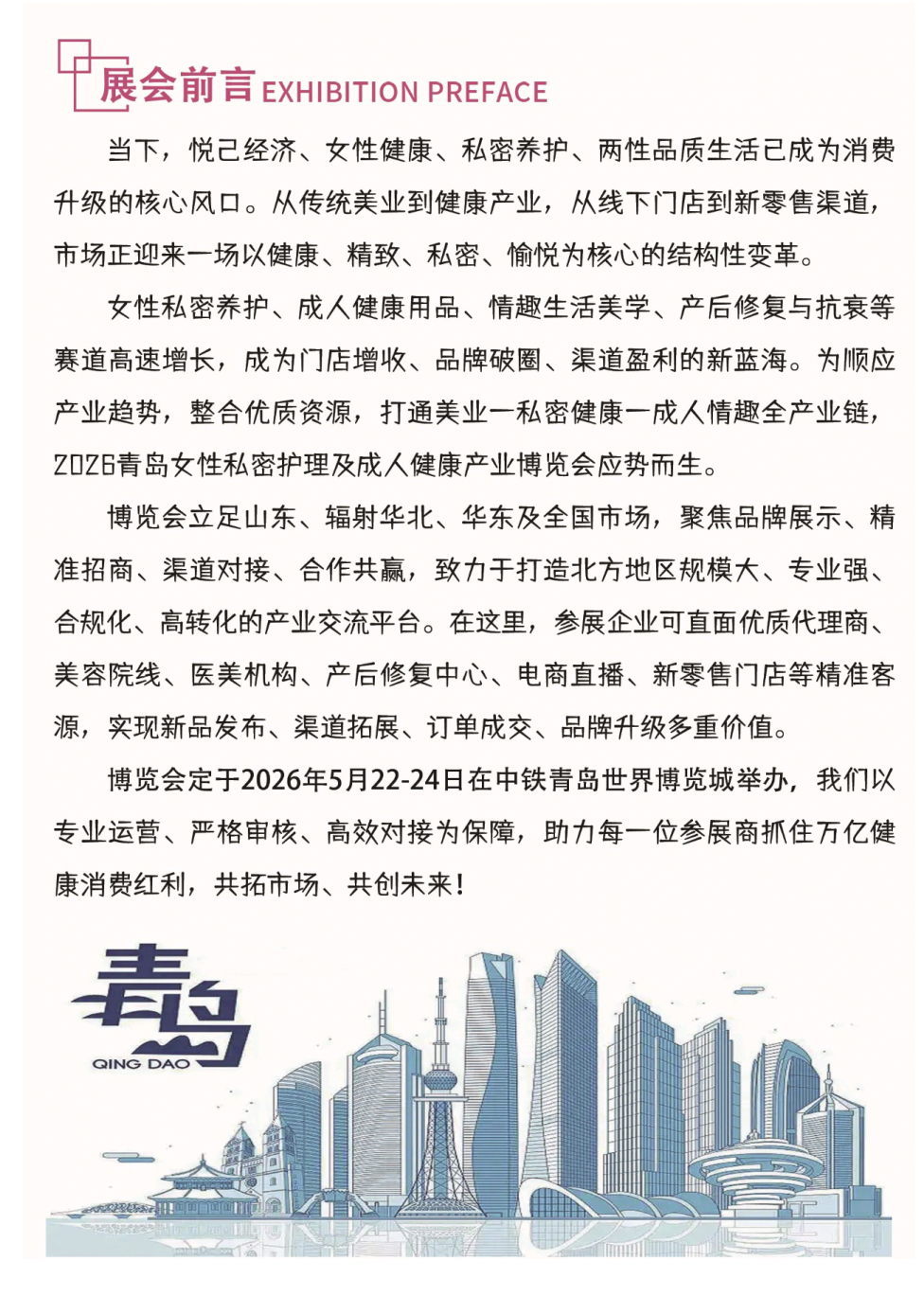 女性私密养护、成人健康用品、情趣生活美学、产后修复与抗衰等赛道高速增长,成为门店增收、品牌破圈、渠道盈利的新蓝海。为顺应产业趋势,整合优质资源,打通美业一私密健康一成人情趣全产业链,2026青岛女性私密护理及成人健康产业博览会应势而生。