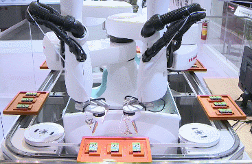 该演示由2台小型超高速、紧凑型机器人MZ04组成,可完成高同步性及高精度的工作,该系统演示的是自动铅笔铅芯的插入工作。