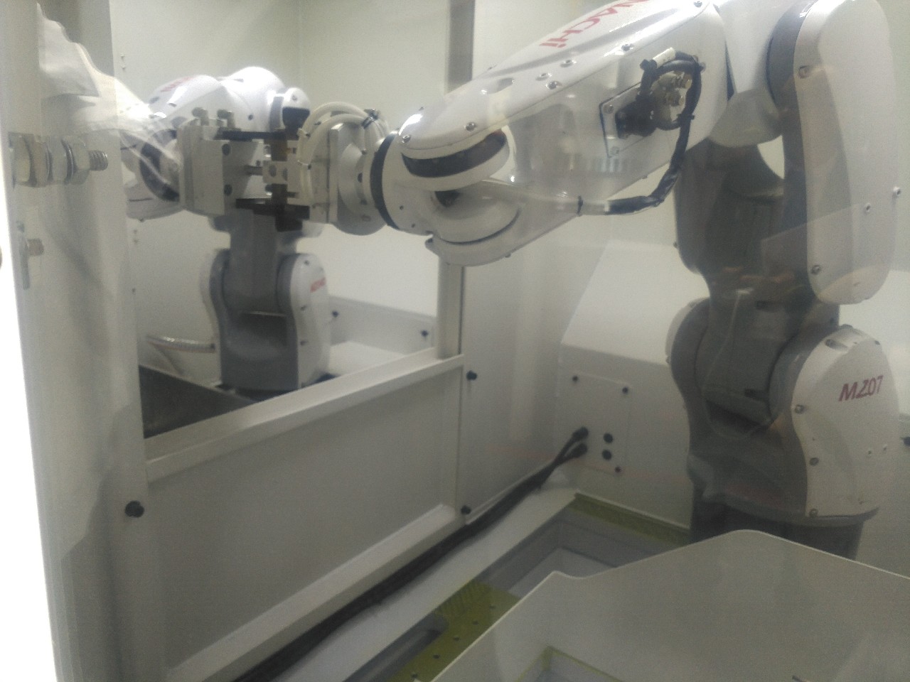 该系统由一套去毛刺标准单元及一套清洗标准单元组合而成。由MZ07机器人完成去毛刺工序后,MZ04D防水仕样机器人完成清洗工作。