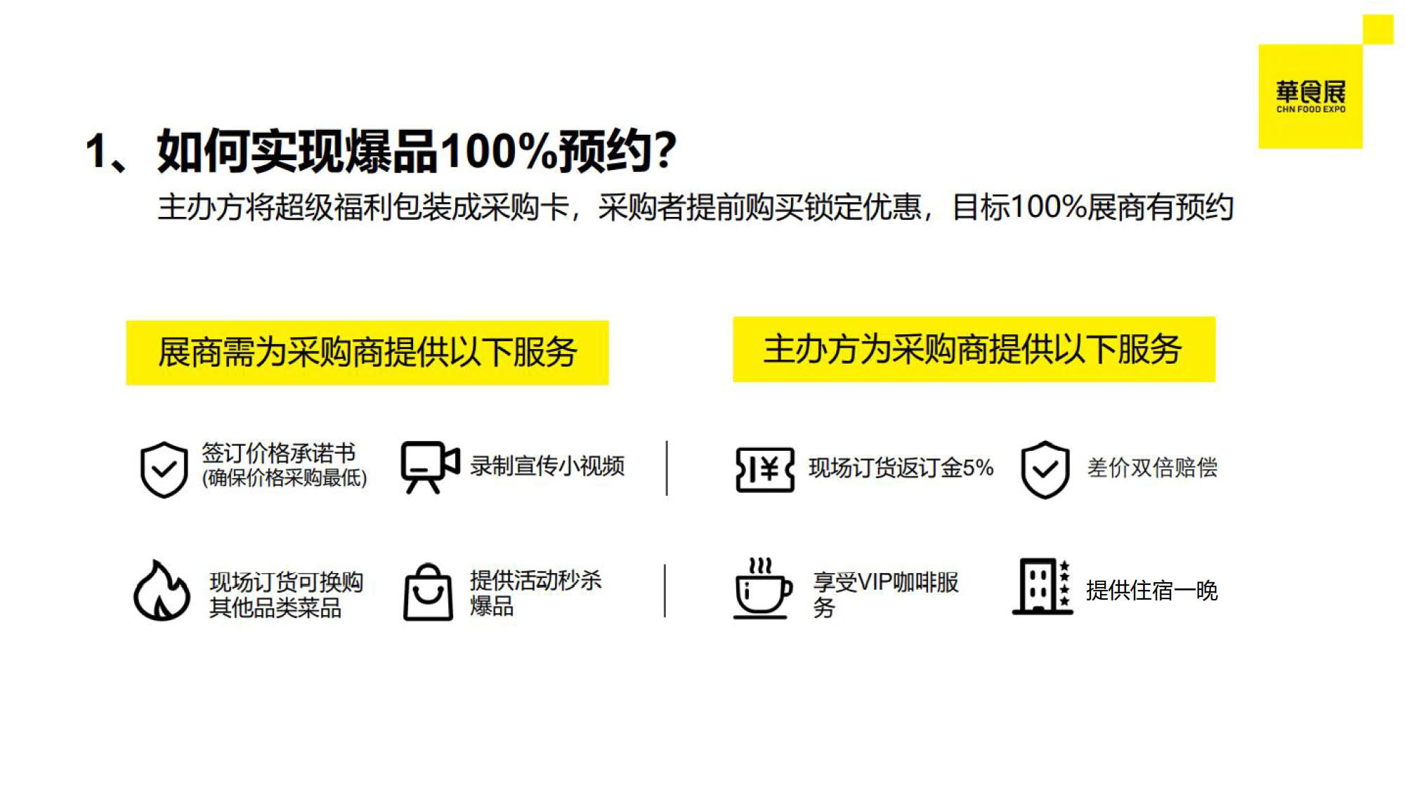 1、主办方将超级福利包装成采购卡,采购者提前获取锁定优惠,大数据匹配,目标100%展商展品有预约;