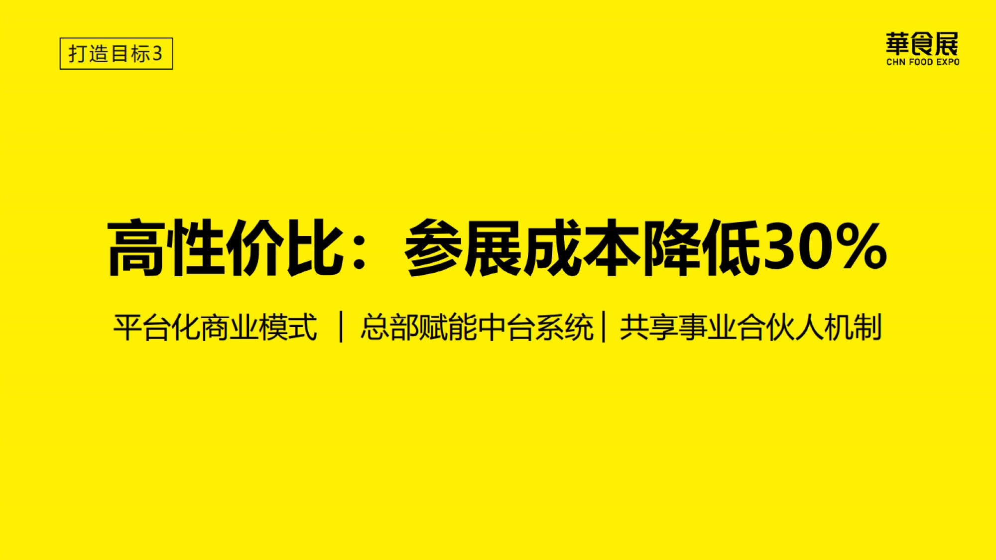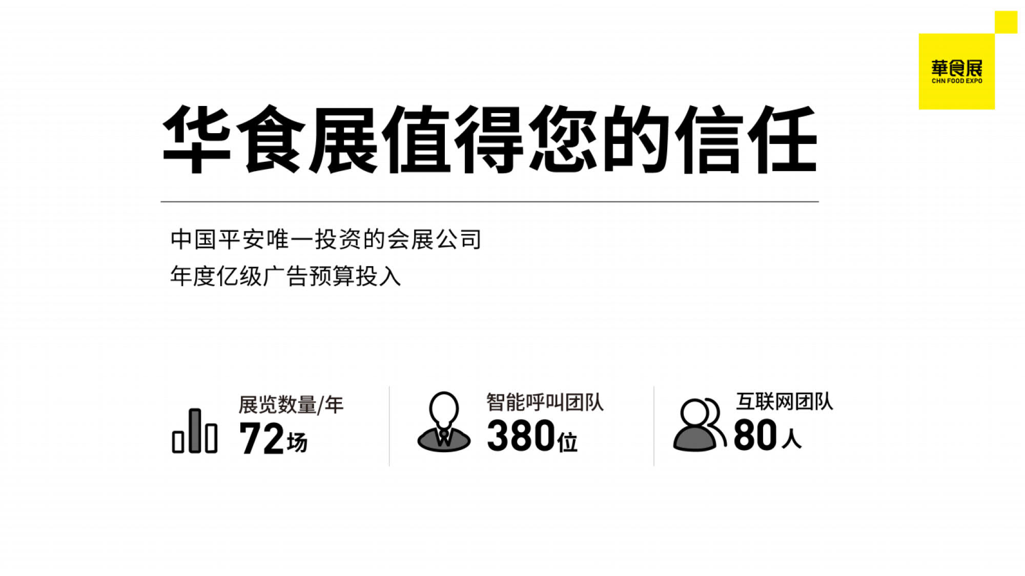 中国平安唯一投资的会展公司(华墨集团)倾力打造第三版图,以数字化全新会展模式重塑中国食材行业会展,以连锁展模式赋能,降本增效,回归用户价值提升,打造更高效的参展服务;用互联网思维赋能;释放食材行业新活力,高频变现,打造更大流量的带货通道;以科技赋能,数字化升级改造会展全流程,撬动万亿级市场,打造更智能的数字化展会。