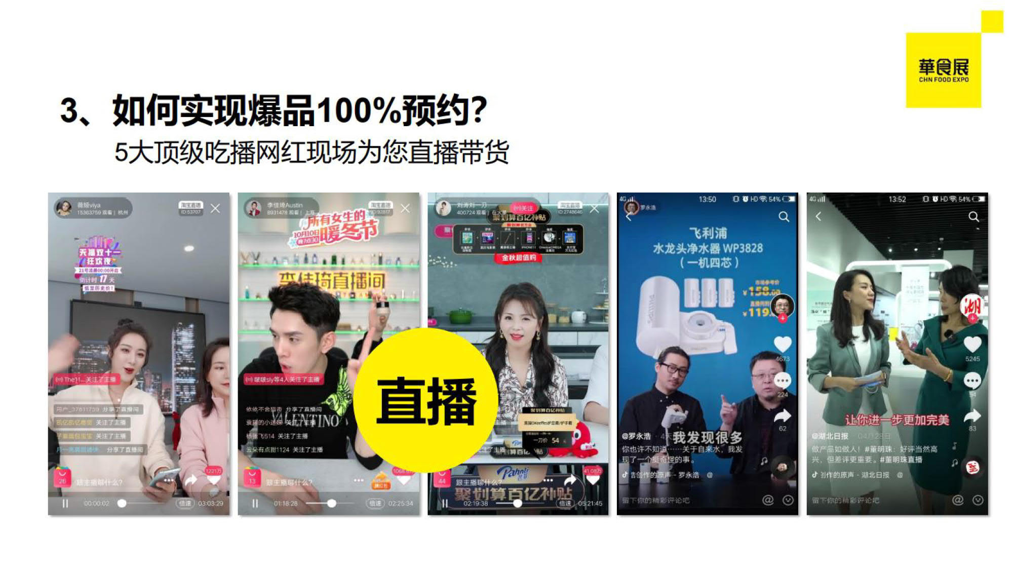 3、5大顶级吃播网红将在展前展中直播宣传及爆品预约带货;