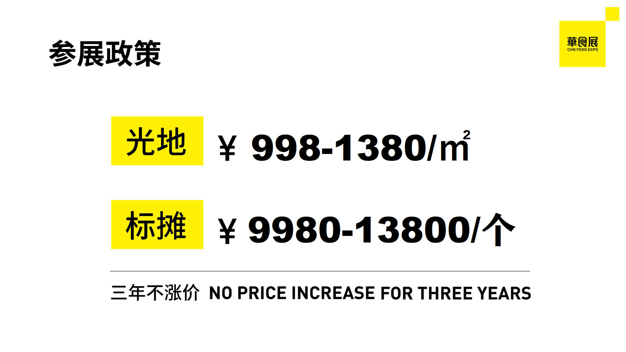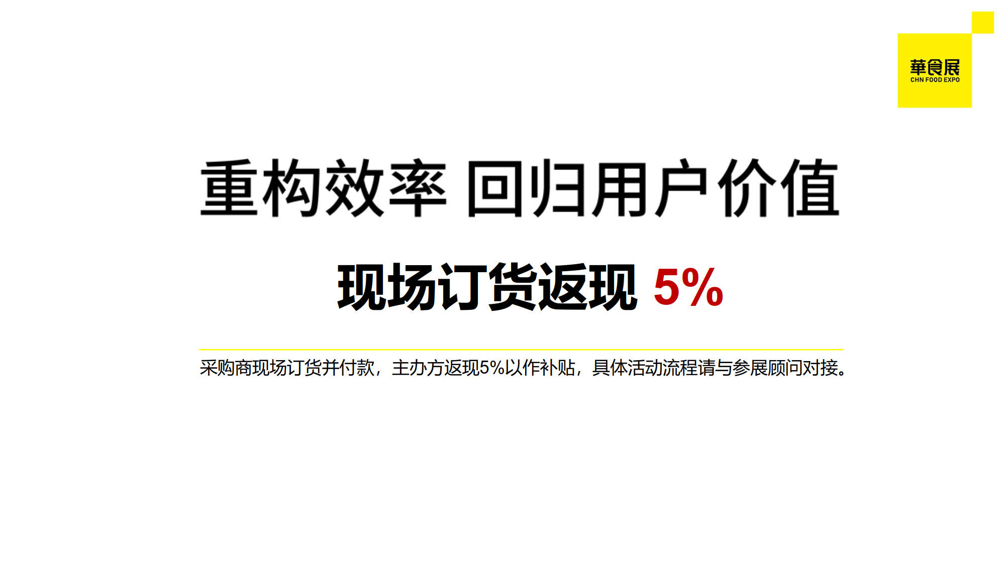 华墨展览顺应时局倾力打造的第三版图——华食展,可谓赢在了起点,华墨展览致力于将其打造成中国食材行业会展标杆。届时将重磅推出采购补贴,即现场订货返定金5%。并承诺连续三年不涨价,这一些系列举措在行业内前所未有,充分体现了华食展重构效率,回归用户价值的深层理念。