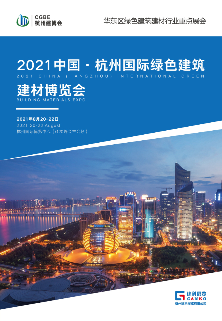 本届展会定于2021年8月20日-22日在杭州国际博览中心(G20杭州峰会主会场)举办。展览会规划展览面积50000平米,集中展示绿色建筑建材、建筑装饰及材料领域新技术、新工艺、新产品,
