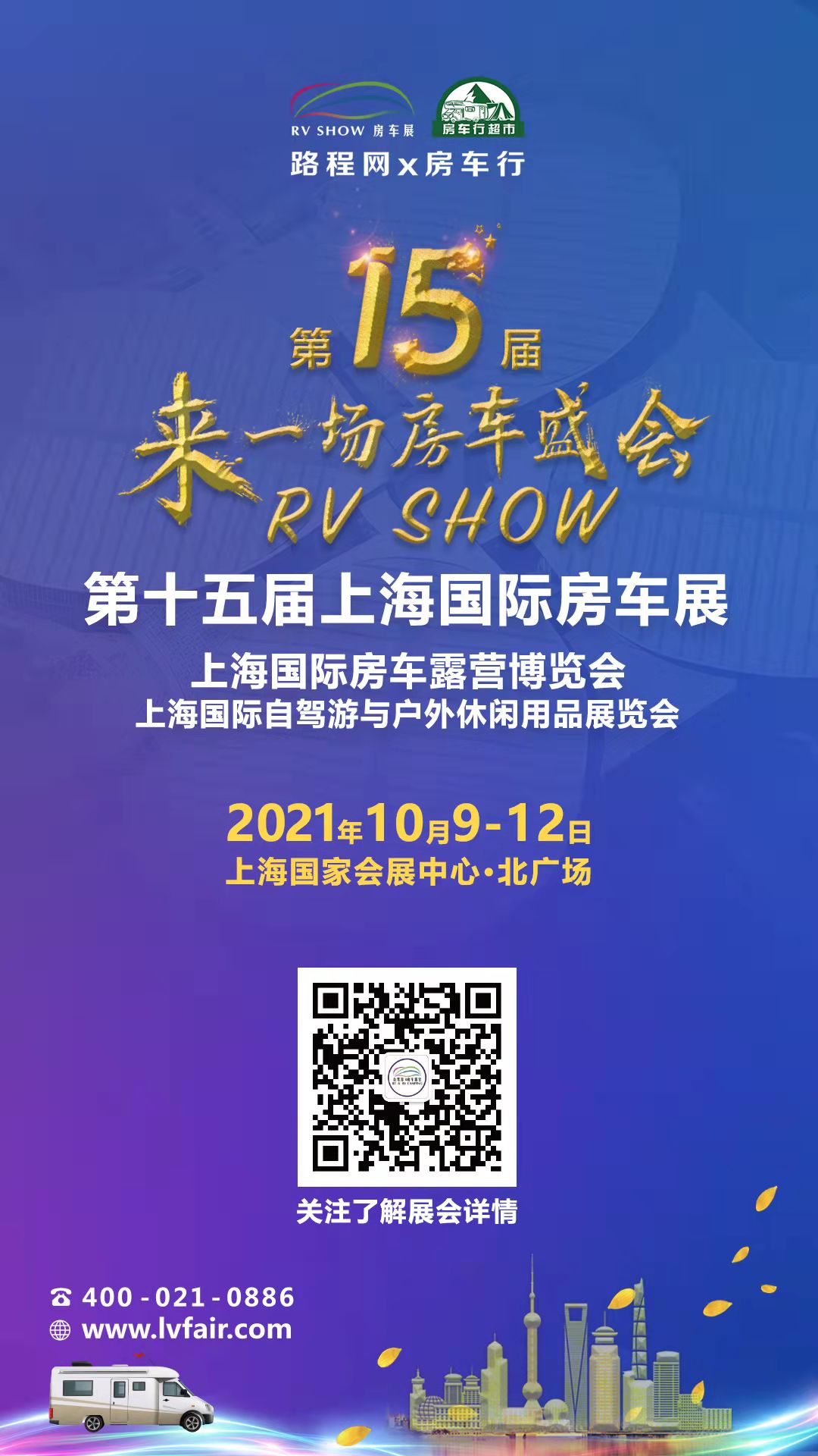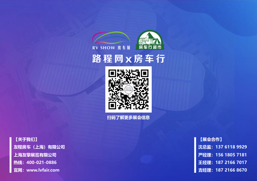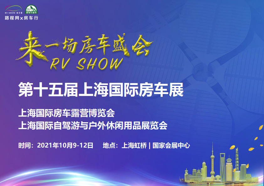 2021 RV SHOW 第十五届上海国际房车展(上海国际房车露营博览会、上海国际自驾游与 户外休闲用品展览会)将于10月9-12日在上海国 家会展中心(上海市青浦区崧泽大道333号)举办,现场将展出包括房车、房车配件、户外露营装备、营地配套设施及装备等房车露营全产业链产品,致力打造房车露营产业体系内展品更全面、服务 更专业的行业交流平台,力争成为自驾游与房车 露营产业中最具影响力的行业盛会。
