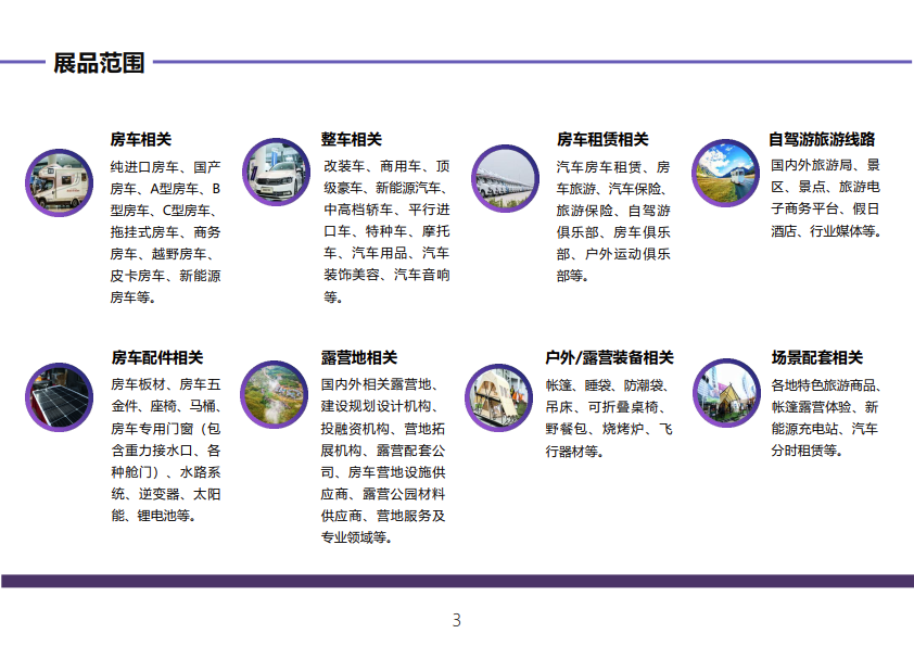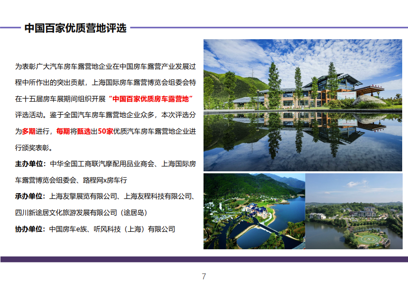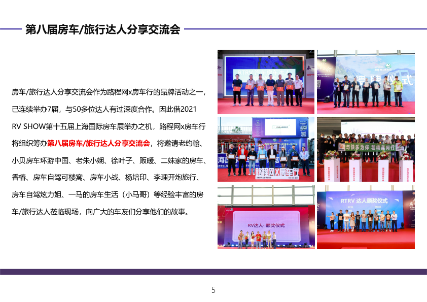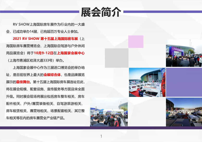 内容摘要: 第十五届上海国际房车展 上海国际房车露营博览会 上海国际自驾游与户外休闲用品展览会 时间:2021年10月9-12日 地点:上海虹桥 | 国家会展中心 展会简介 RV SHOW作为行业内的一大盛会……