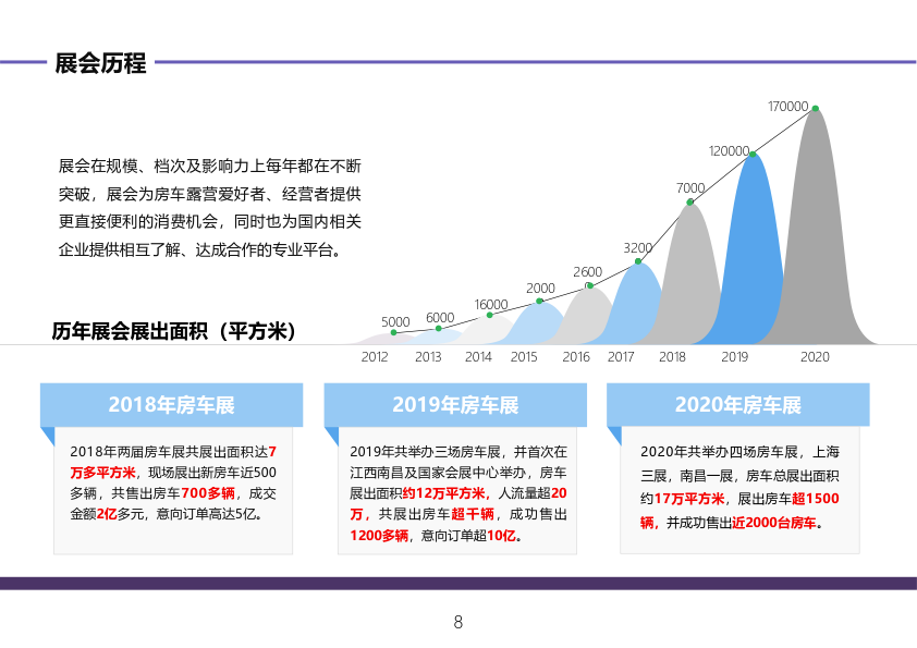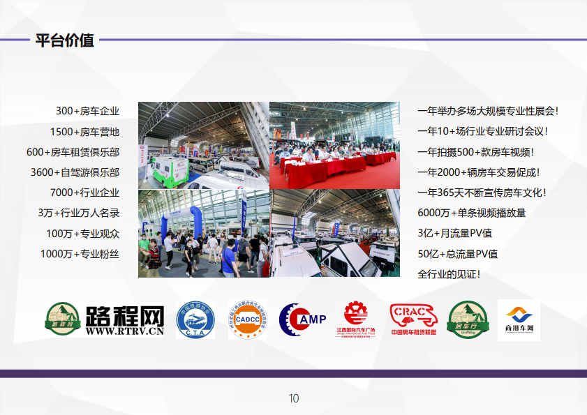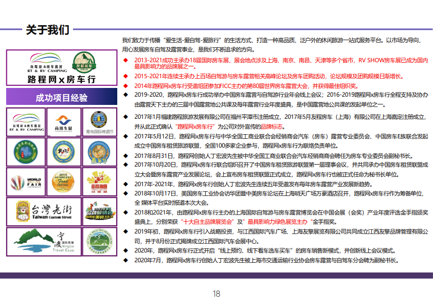 RV SHOW作为行业内的一大盛会,已成功举办18届,展会地点覆盖上海、南京、南昌、天 津等多个省市,已有超百万专业人士参加。