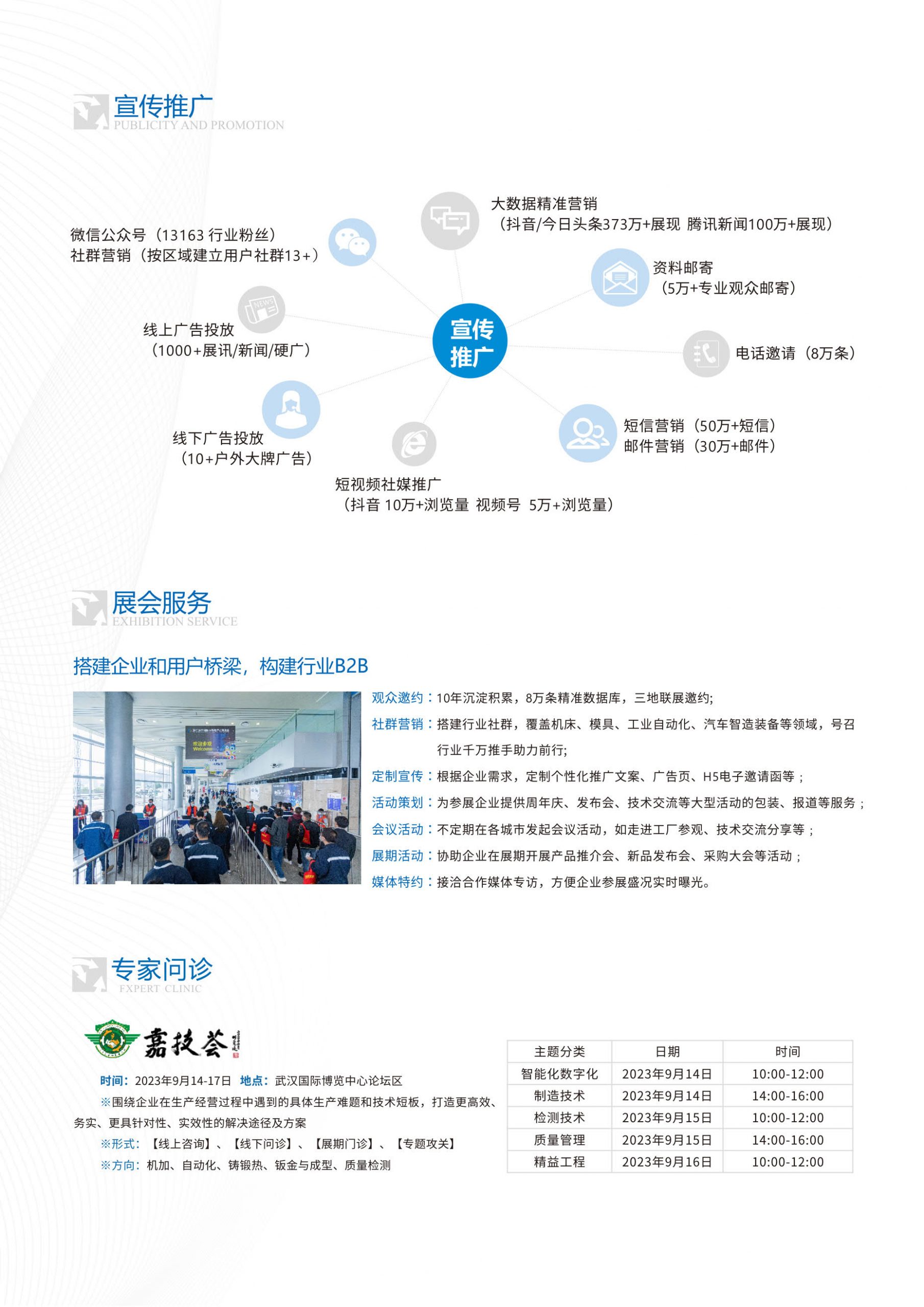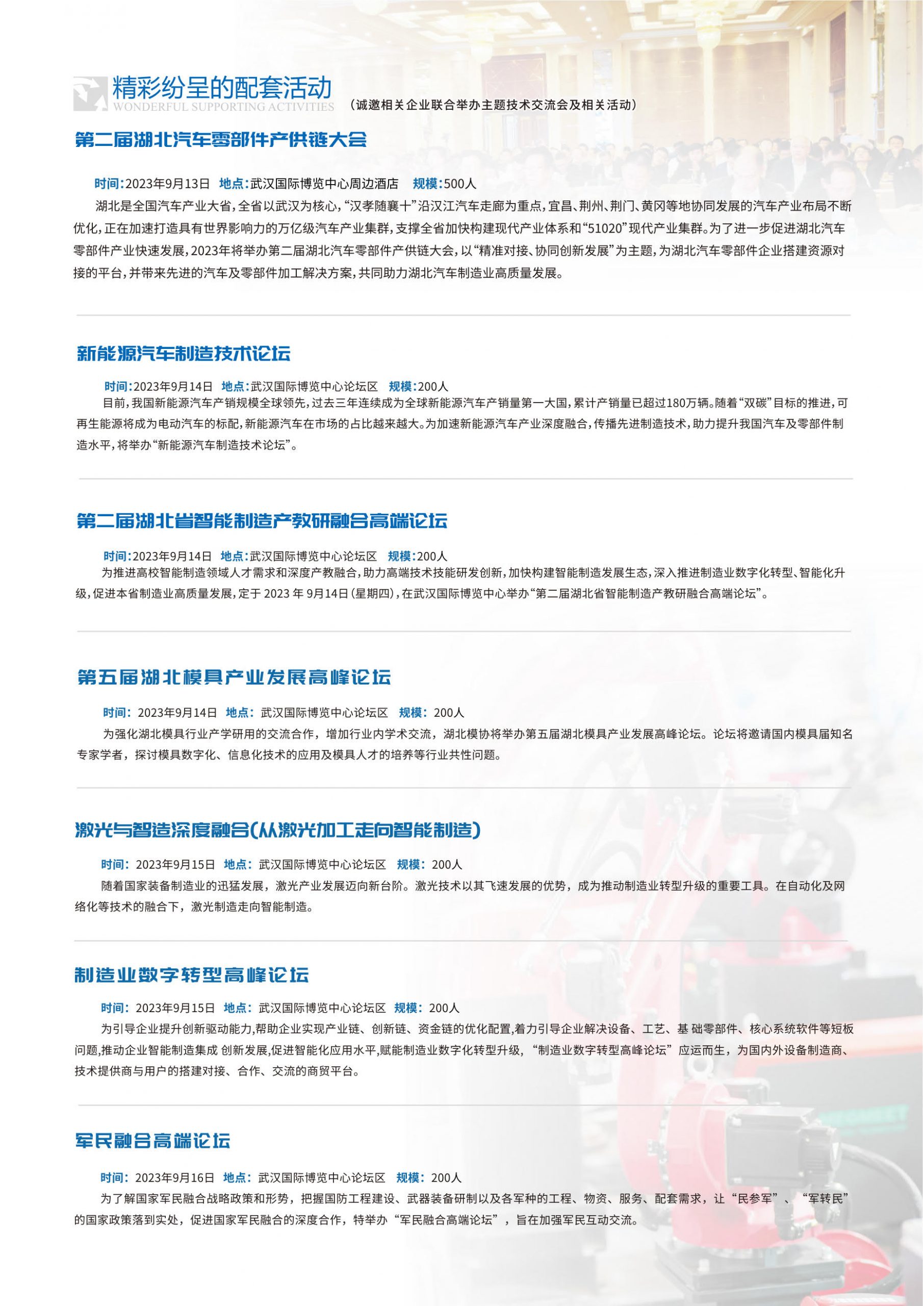 展会根据当前市场需求联合参展企业以产业集群化、高端化、智能化、绿色化发展,推进先进制造业、生产性服务业、数字经济和实体经济的深度融合。将深入挖掘更多行业新产品、新技术、新工艺,多元化的主题活动:以非标产品联合开发、设备选型与用户产品加工提升配对、第二届湖北汽车行业产供链大会等,围绕“三新”为参展企业打造集品牌展示、技术交流、贸易合作及市场开拓于一体的产业展示平台,欢迎各参展企业携新品参展。