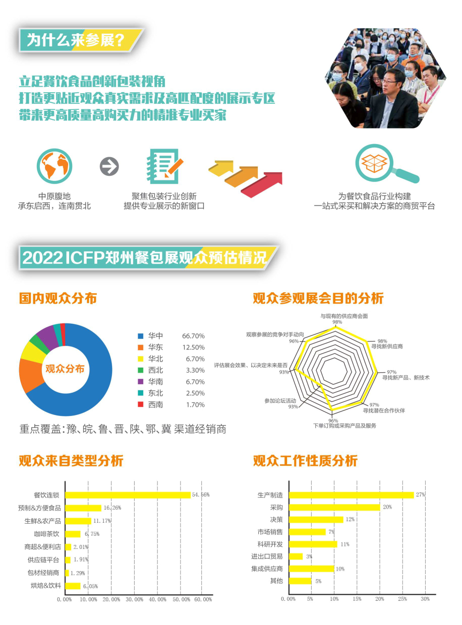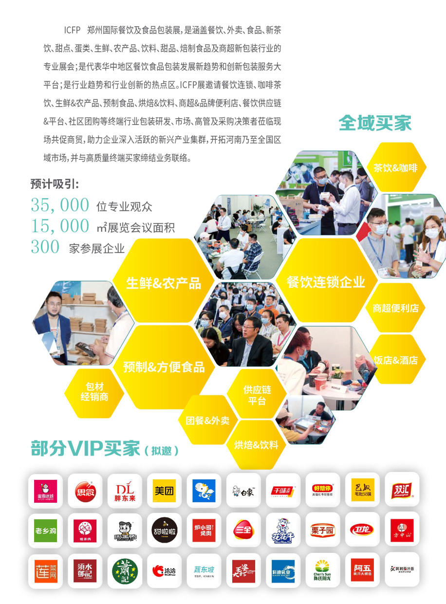ICFP 中部(郑州)国际餐饮及食品包装展,是涵盖餐饮、外卖、食品、新茶饮、甜点、蛋类、生鲜、农产品、饮料、甜品、焙制食品及商超新包装行业的专业展会;是代表华中地区餐饮食品包装发展新趋势和创新包装服务大平台;是行业趋势和行业创新的热点区。ICFP展邀请餐饮连锁、咖啡茶饮、生鲜&农产品、预制食品、烘焙&饮料、商超&品牌便利店、餐饮供应链&平台、社区团购等终端行业包装研发、市场、高管及采购决策者莅临现场共促商贸,助力企业深入活跃的新兴产业集群,开拓河南乃至全国区域市场,并与高质量终端买家缔结业务联络。