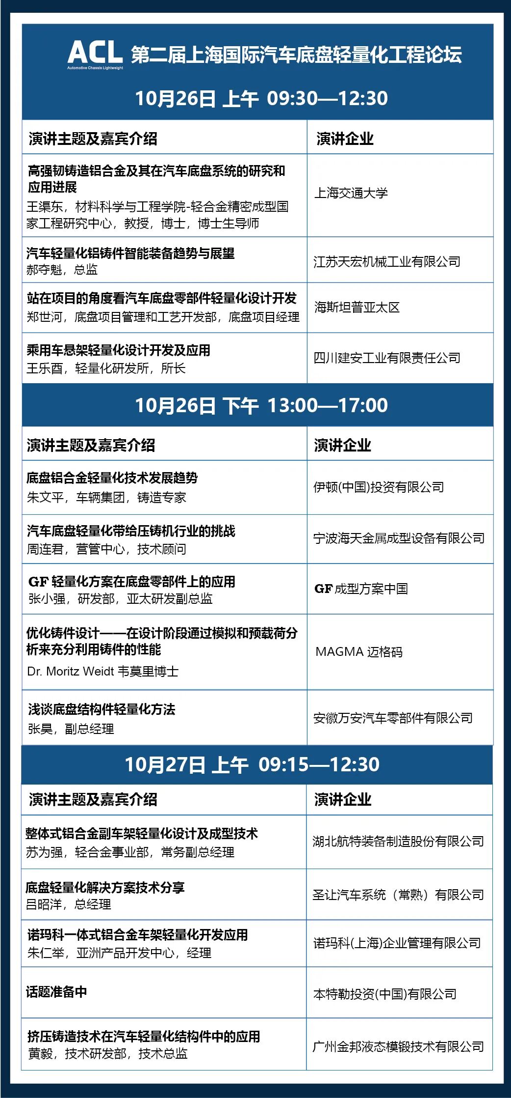 会议介绍 ACL 上海国际汽车底盘系统轻量化工程论坛是AEE 汽车工程会议平台专门为汽车底盘系统轻量化创办的会议品牌,ACL 第二届底盘轻量化工程大会将涉及乘用车、商用车、新能源汽车底盘的轻量化结构设计、轻质材料、轻量化工艺技术解决方案,以及轻量化产品展示,从而减轻汽车底盘重量,提升底盘性能,促进整车安全、驾驶、舒服等综合性能的提升。 ACL会议议程
