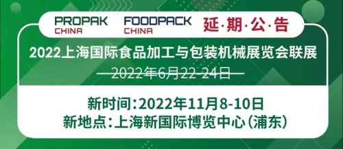 根据国家疫情防控办最新发布的防控措施,考虑到所有参展人员的健康与安全,经过慎重考虑,我们决定将由上海博华国际展览有限公司、中国包装和食品机械有限公司、中国食品和包装机械工业协会主办,原定于2022年6月22-24日在国家会展中心(上海)举办的2022上海国际食品加工与包装机械展览会联展延期至2022年11月8-10日在上海新国际博览中心举办。