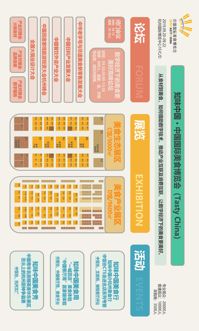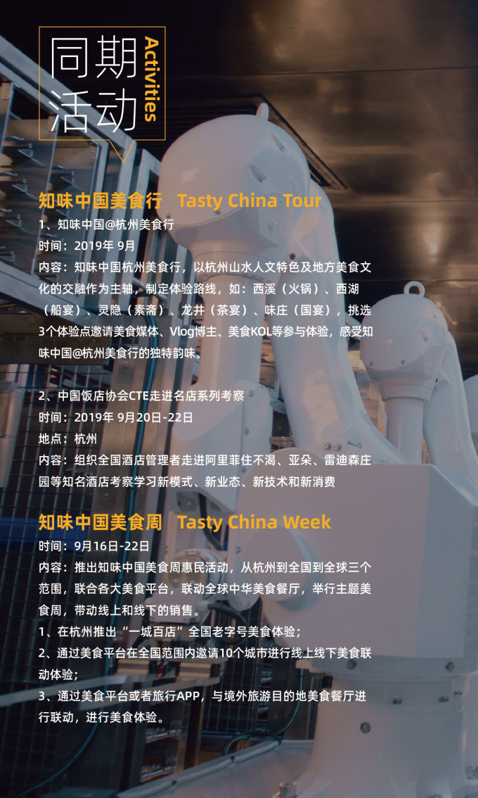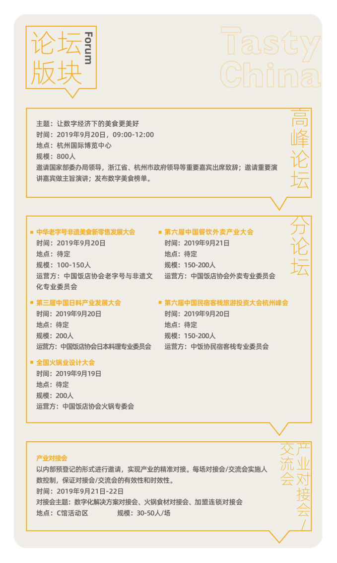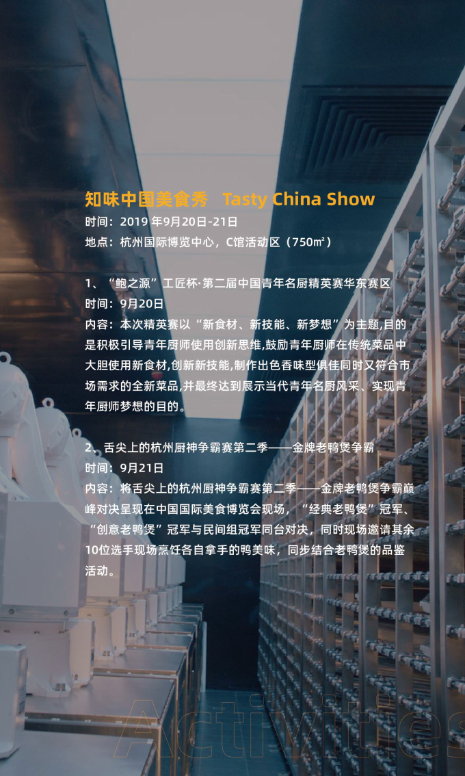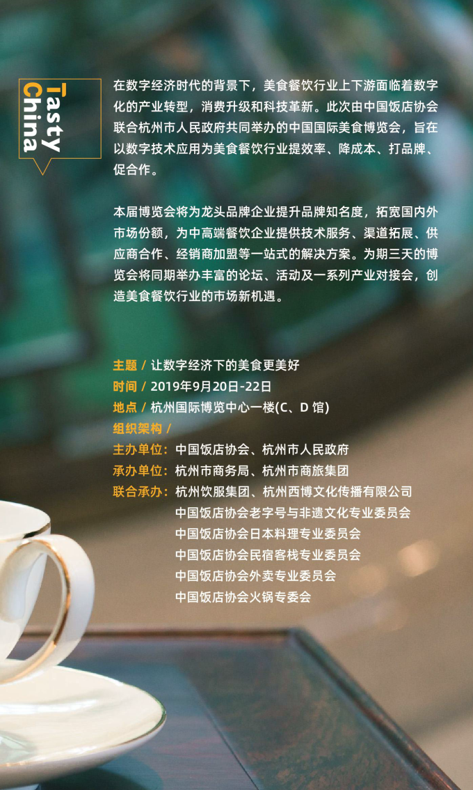 内容摘要: 中国国际美食博览会 Tasty China 展出时间:2019年9月20号-22号 主题/让数字经济下的美食更美好 时间/2019年9月20日22日 地点/杭州国际博览中心一楼(C、D馆) 参展咨询:18311227679 周先生……
