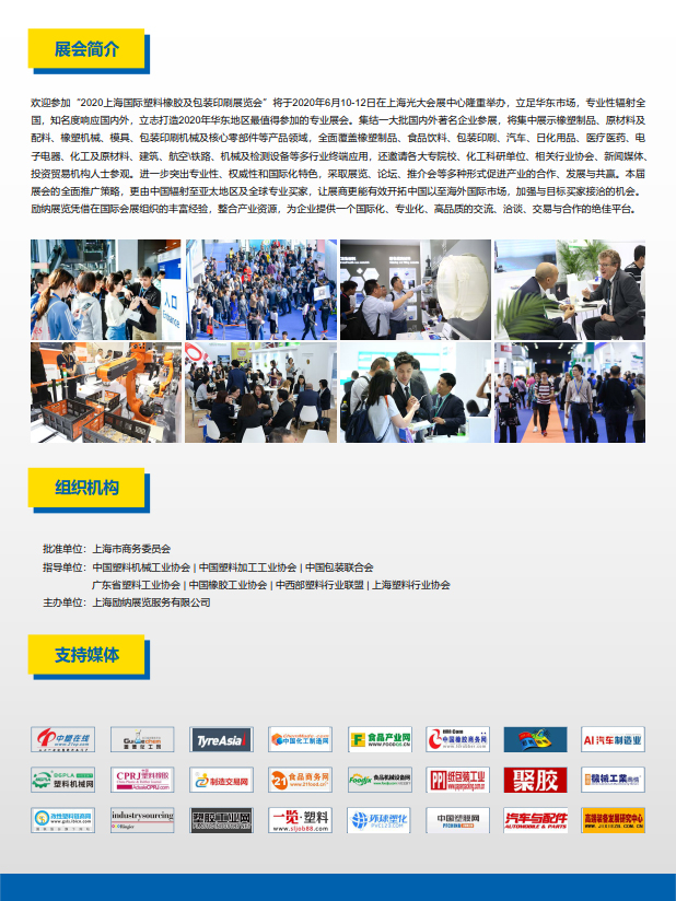 欢迎参加“2020上海国际塑料橡胶及包装印刷展览会”将于2020年6月10-12日在上海光大会展中心隆重举办,立足华东市场,专业性辐射全 国,知名度响应国内外,立志打造2020年华东地区最值得参加的专业展会。集结一大批国内外著名企业参展,将集中展示橡塑制品、原材料及 配料、橡塑机械、模具、包装印刷机械及核心零部件等产品领域,全面覆盖橡塑制品、食品饮料、包装印刷、汽车、日化用品、医疗医药、电 子电器、化工及原材料、建筑、航空\铁路、机械及检测设备等多行业终端应用,还邀请各大专院校、化工科研单位、相关行业协会、新闻媒体、投资贸易机构人士参观。进一步突出专业性、权威性和国际化特色,采取展览、论坛、推介会等多种形式促进产业的合作、发展与共赢。本届 展会的全面推广策略,更由中国辐射至亚太地区及全球专业买家,让展商更能有效开拓中国以至海外国际市场,加强与目标买家接洽的机会。 励纳展览凭借在国际会展组织的丰富经验,整合产业资源,为企业提供一个国际化、专业化、高品质的交流、洽谈、交易与合作的绝佳平台。