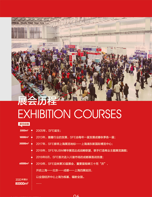 上届SFE上海国际连锁加盟展览会与博华(UBM)旗下上海酒店工程及商业空间系列展(HOTEL PLUS)于2020年4月25-27日在上海新国际博览中 心联合举办,展会整体规模达到25万平米。旨在将商业的上下游配套资源与连锁加盟的成熟商业实体相互贯穿以最大程度拓宽投资交际视野与 资源融合。