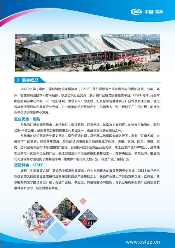 内容摘要: 2020中国(常熟)国际缝制设备展览会(CISEE)是引领服装产业发展方向的更加高效、节能、环保、智能的前沿技术和时尚趋势,以及纺织行业交流、展示和产业链对接的重要平台。CISE……