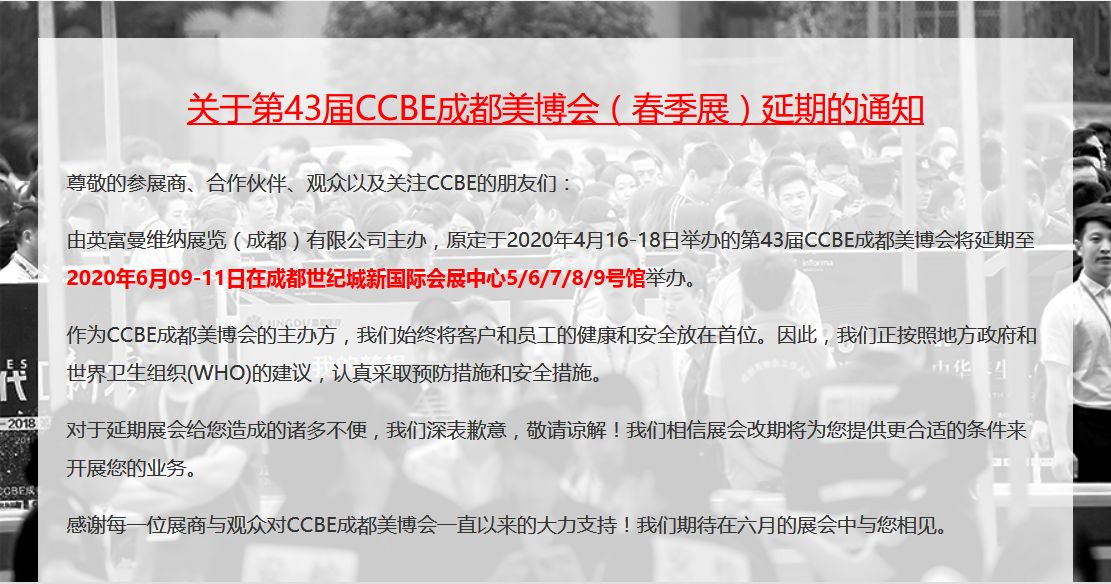 关于第43届CCBE成都美博会(春季展)延期的通知