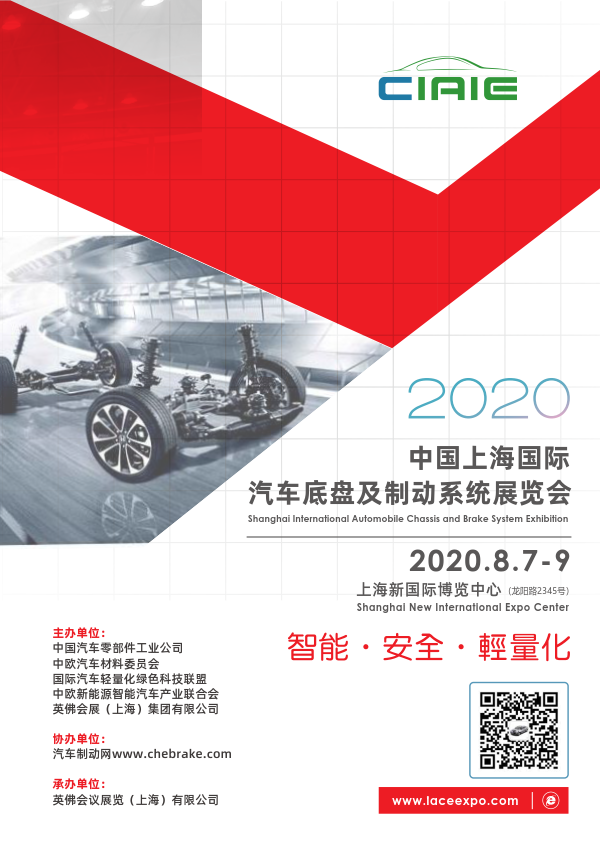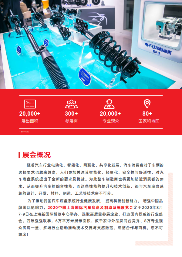 为了推动我国汽车底盘系统行业健康发展, 提高科技创新能力, 增强中国品 牌国际影响力,2020中国上海国际汽车底盘及制动系统展览会定于2020年8月 7-9日在上海新国际博览中心举办,选取高质量参展企业,打造国内权威的行业盛 会。四展强强联手,6万平方米展示面积、数千家中外品牌同台竞秀、8万专业观 众济济一堂、多场行业活动推动技术交流与灵感激荡、缔结合作与商机,您不可 缺席!