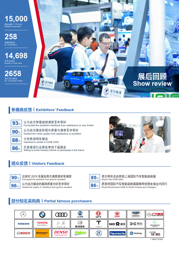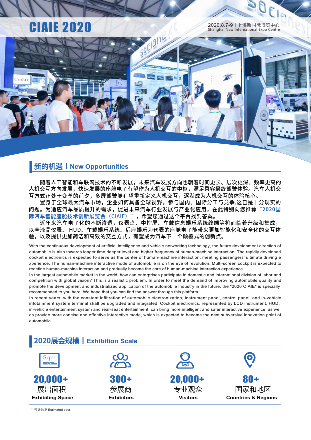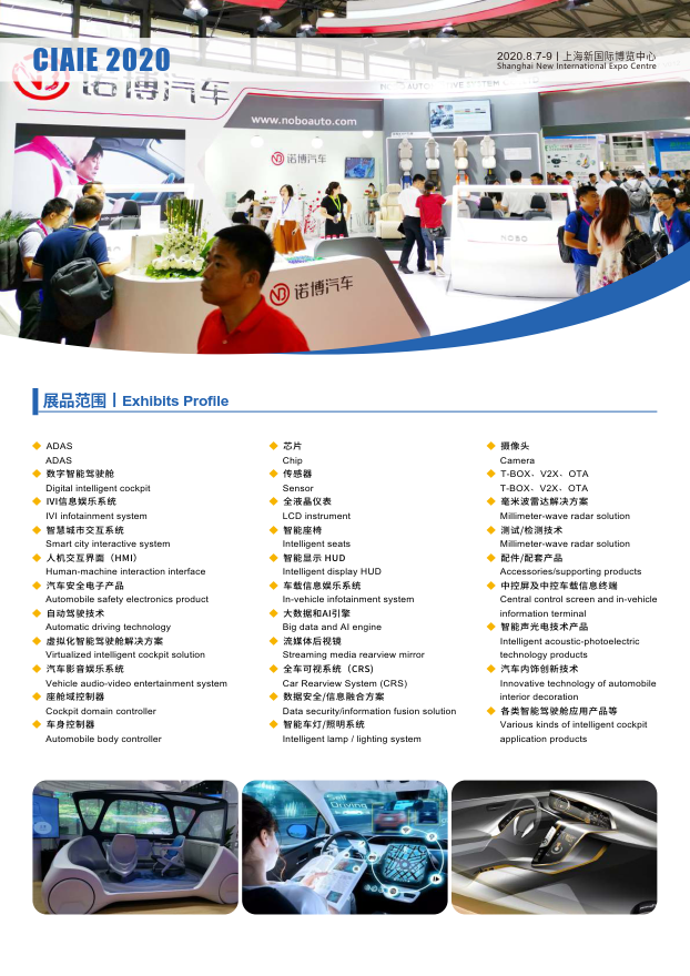 置身于全球最大汽车市场,企业如何具备全球视野,参与国内、国际分工与竞争,这已是十分现实的 问题。为适应汽车品质提升的需求,促进未来汽车行业发展与产业化应用,在此特别向您推荐“2020国 际汽车智能座舱技术创新展览会(CIAIE)”,希望您通过这个平台找到答案。
