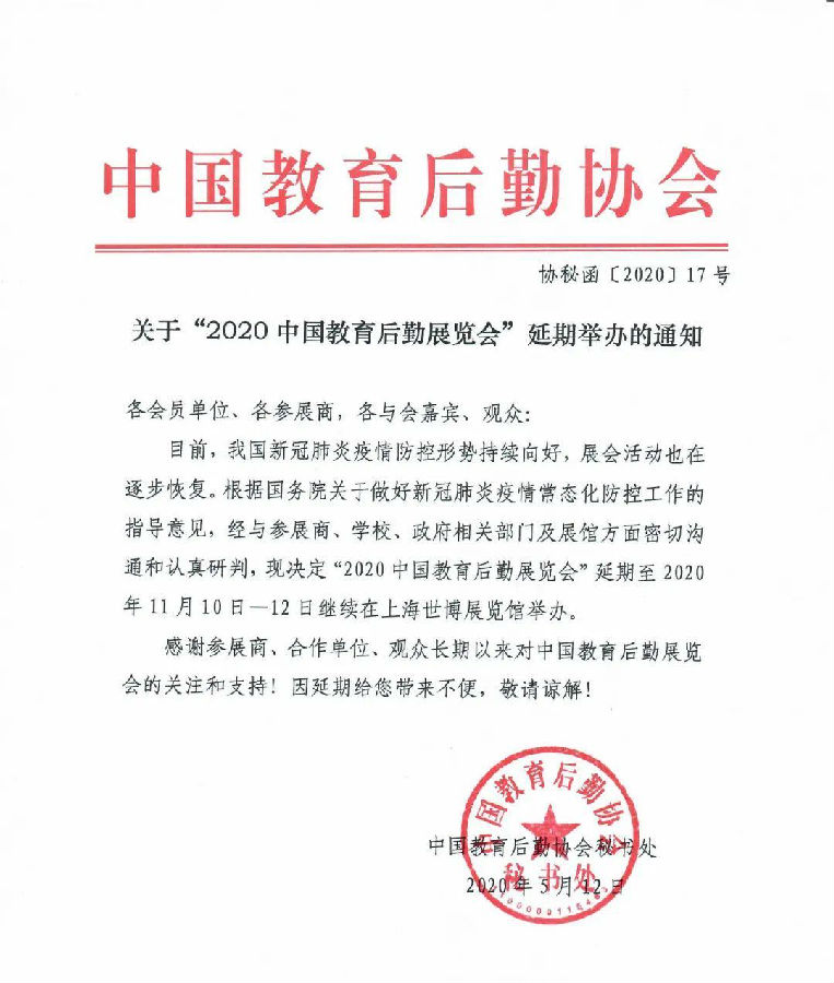内容摘要: 关于“2020中国教育后勤展览会”延期举办的通知 各会员单位、各参展商,各与会嘉宾、观众: 目前,我国新冠肺炎疫情防控形势持续向好,展会活动也在逐步恢复。根据国务院关于做……