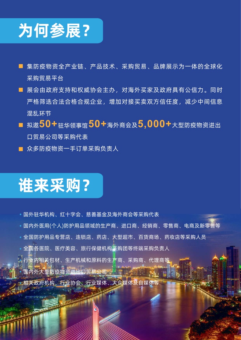 2020中国国际防疫及防护物资交易会主要面向中国各级地方政府、医疗机构、国外驻华使馆、商务处、商协会、贸易公司、外资企业和外贸公司。将对国内外防疫物资采购需求高质量采购商/团体等有序邀请、引导至交易会现场的优秀供应商进行精准对接,从而进一步实现消化产能、促进供需、支援抗疫、树立质量过硬的中国品牌形象等多方共赢的交流、交易平台。