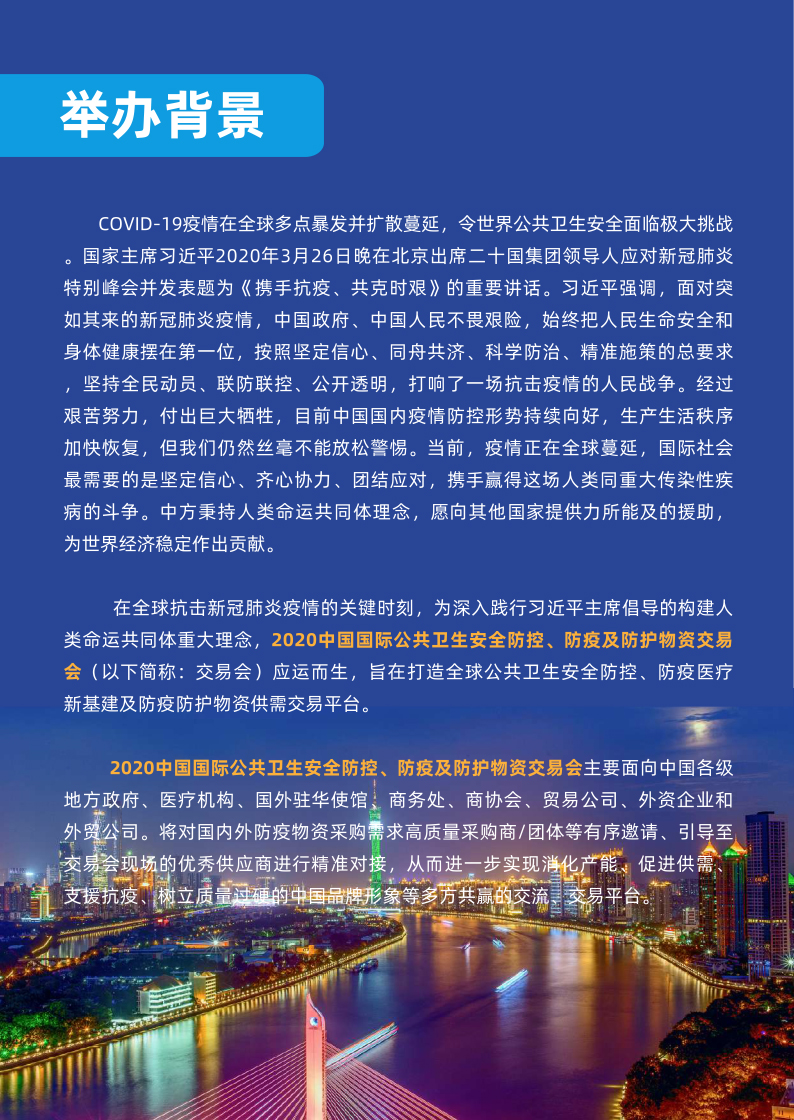 在全球抗击疫情的关键时刻,为深入践行构建人类ming运共同体重大理念,2020中国国际公共卫生安全防控、防疫及防护物资交易会(以下简称:交易会)应运而生,旨在打造全球公共卫生安全防控、防疫医疗新基建及防疫防护物资供需交易平台。