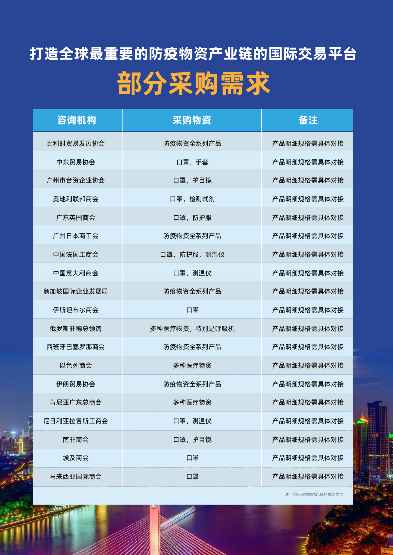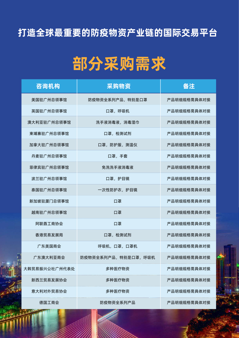2020中国国际防疫及防护物资交易会主要面向中国各级地方政府、医疗机构、国外驻华使馆、商务处、商协会、贸易公司、外资企业和外贸公司。将对国内外防疫物资采购需求高质量采购商/团体等有序邀请、引导至交易会现场的优秀供应商进行精准对接,从而进一步实现消化产能、促进供需、支援抗疫、树立质量过硬的中国品牌形象等多方共赢的交流、交易平台。