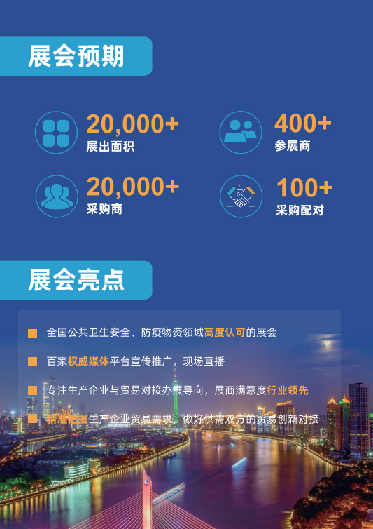 2020中国国际防疫及防护物资交易会主要面向中国各级地方政府、医疗机构、国外驻华使馆、商务处、商协会、贸易公司、外资企业和外贸公司。将对国内外防疫物资采购需求高质量采购商/团体等有序邀请、引导至交易会现场的优秀供应商进行精准对接,从而进一步实现消化产能、促进供需、支援抗疫、树立质量过硬的中国品牌形象等多方共赢的交流、交易平台。