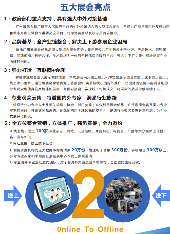 2020年年初新冠肺炎疫情发生后,以总书记为核心的党中央高度重视,把疫情防控作为头等大事来 抓,最终在党的强力领导和全国人民的共同努力下,我国率先成功控制疫情,复产复工有序推进,但国外 疫情却不断蔓延,感染人数持续上升,给世界经济增长蒙上一层深厚的阴影。在消费升级和新冠疫情的双 重大背景下,2020年第28届广州博览会将重点打造2020年国际公共卫生防疫物资展专业馆,依托广东防 疫产业雄厚的产业优势、背靠祖国面向全球的区位优势,推动以华南为中心、全国防疫产业共同发展;让 中国医疗健康防疫物资品类更加完善,质量更加过硬,促进中国医疗健康防疫物资畅销全球,为中国人民 健康,世界人民健康做出积极地贡献。