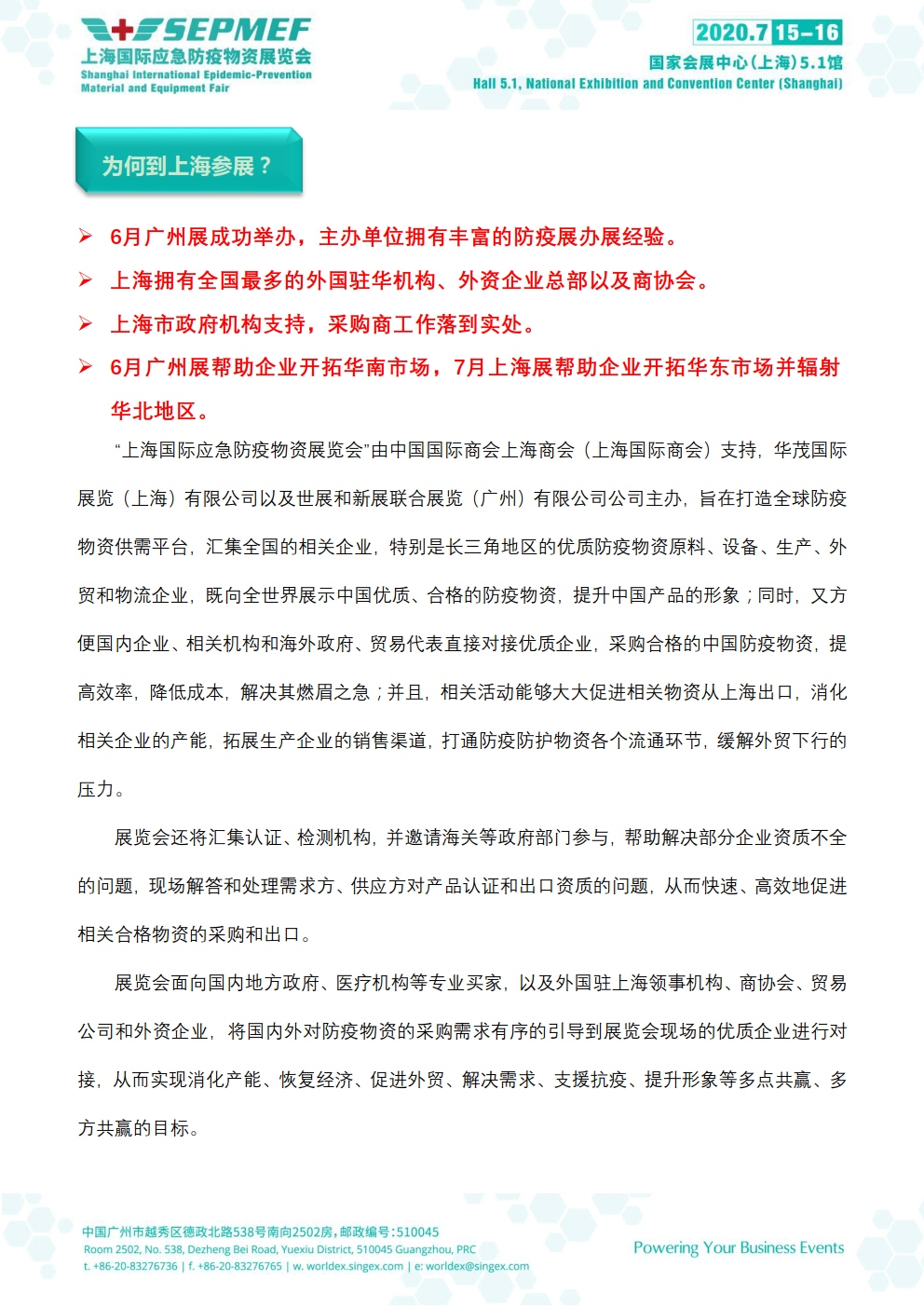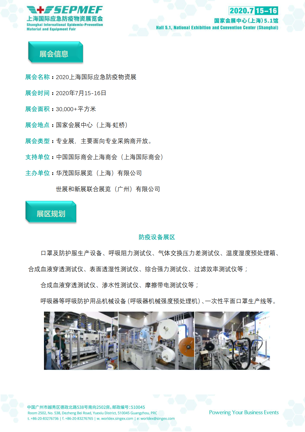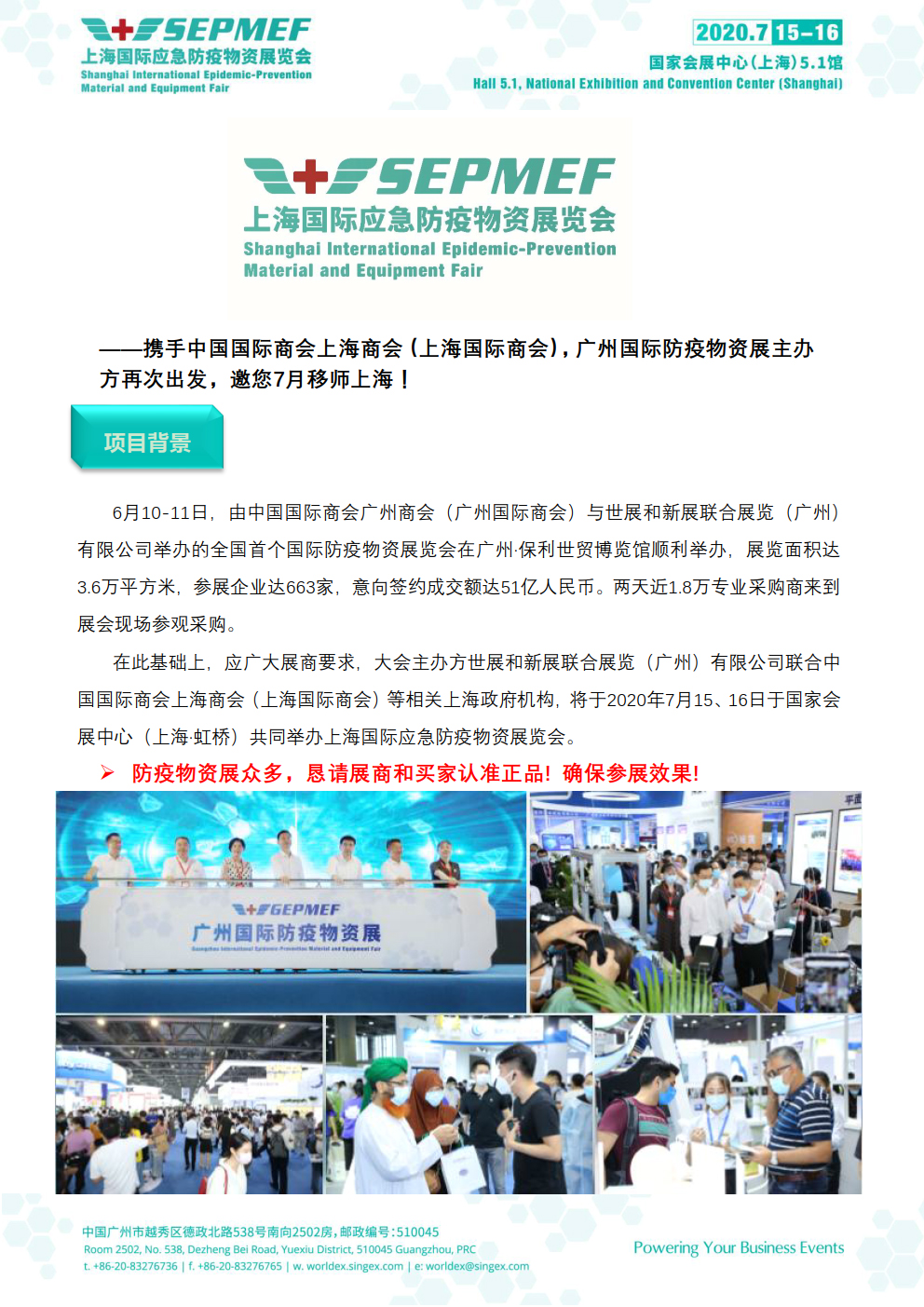 在此基础上,应广大展商要求,大会主办方世展和新展联合展览(广州)有限公司联合中 国国际商会上海商会(上海国际商会)等相关上海政府机构,将于2020年7月15、16日于国家会 展中心(上海·虹桥)共同举办上海国际应急防疫物资展览会。