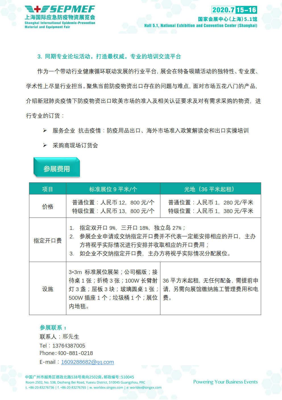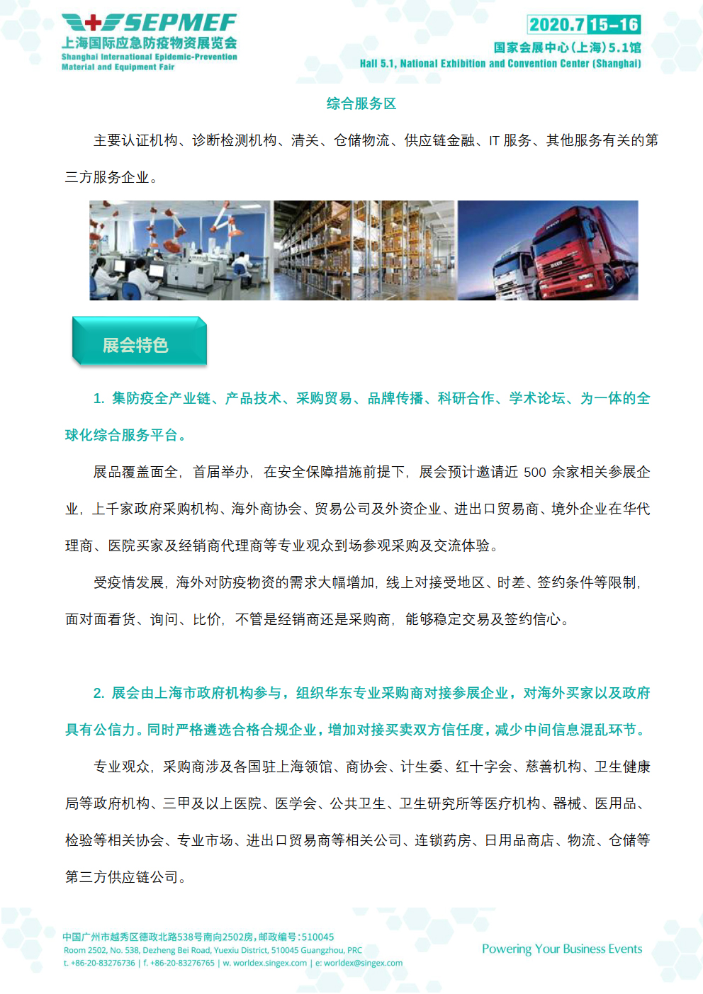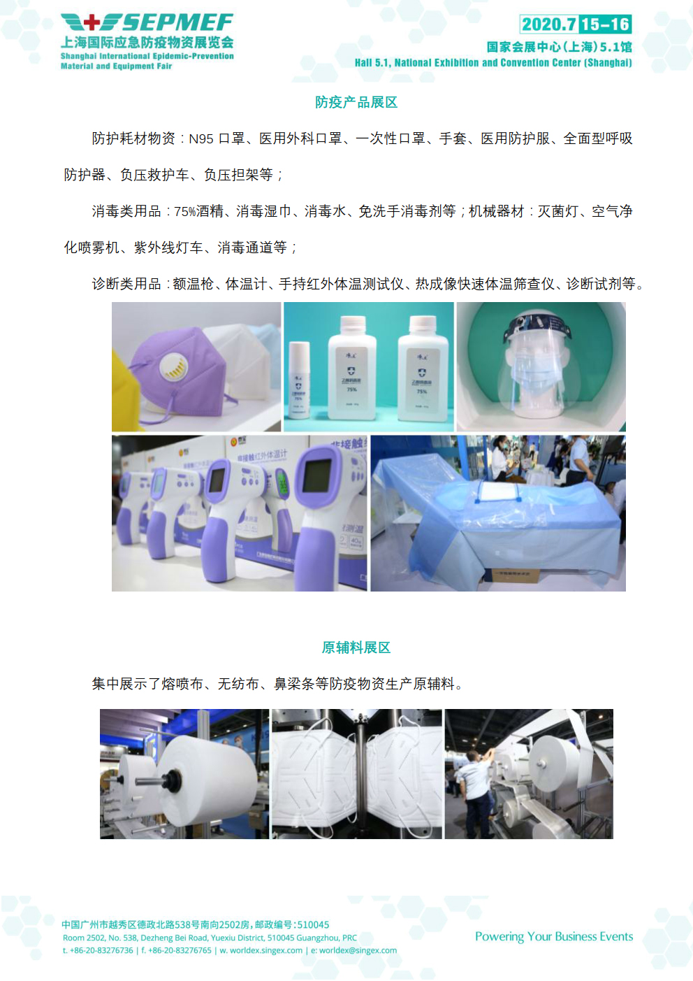 在此基础上,应广大展商要求,大会主办方世展和新展联合展览(广州)有限公司联合中 国国际商会上海商会(上海国际商会)等相关上海政府机构,将于2020年7月15、16日于国家会 展中心(上海·虹桥)共同举办上海国际应急防疫物资展览会。