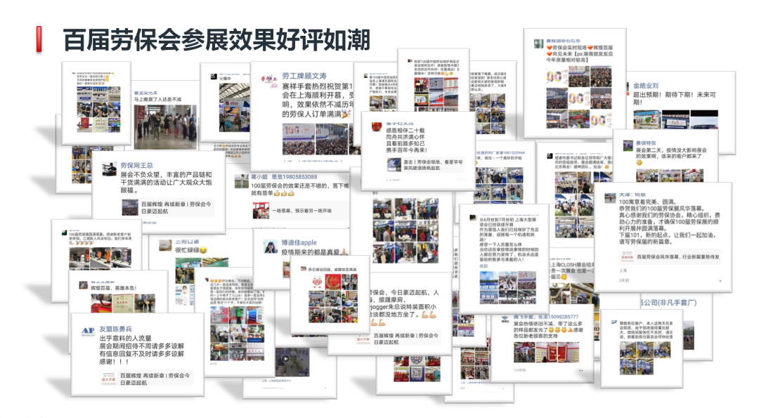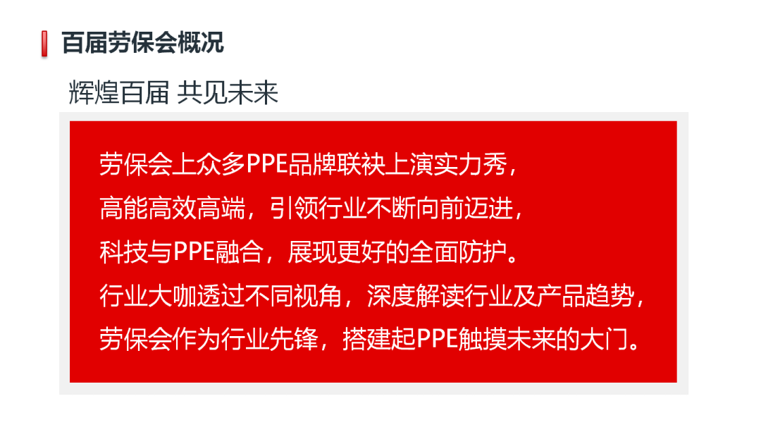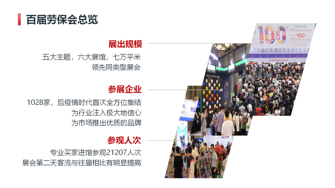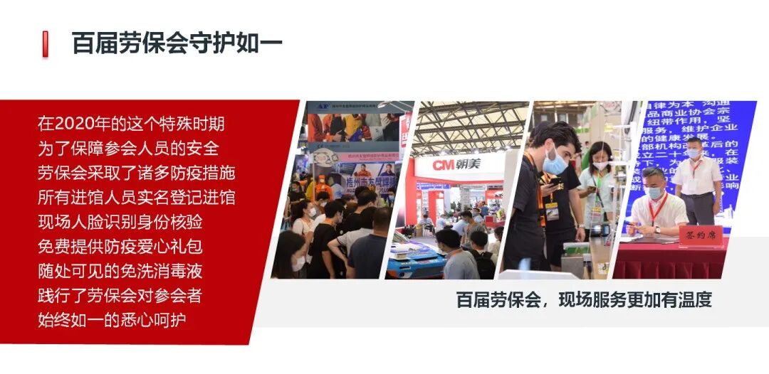 今年的100届劳保会虽然顺利举办,但是无论从规模上还是活动上都留有太多遗憾,有超过800家企业因为疫情原因退展,企业家们纷纷向我们表示其自身强烈的参展意愿,很遗憾错过了100届盛典。