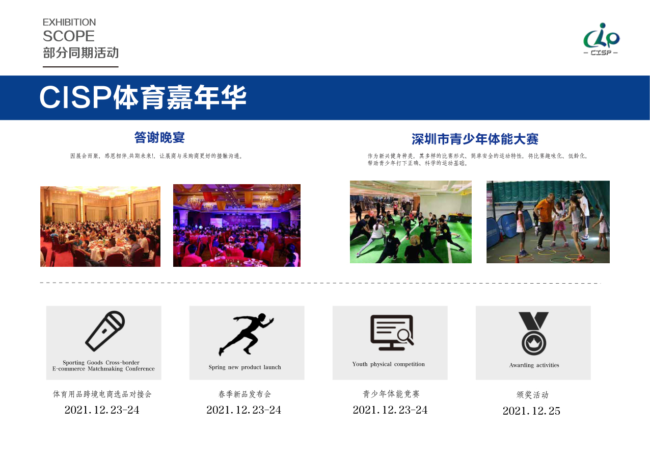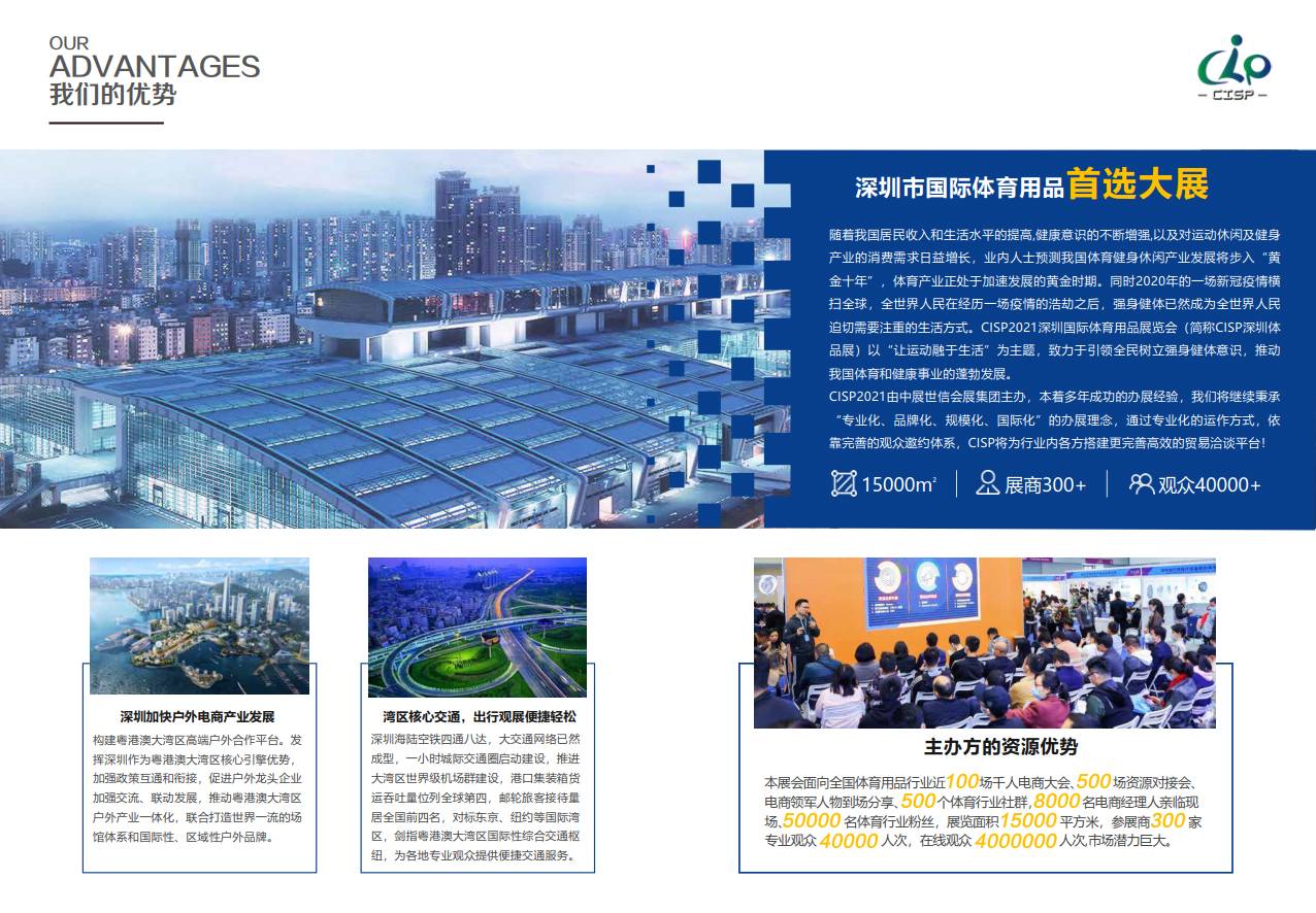 随着我国居民收入和生活水平的提高,健康意识的不断增强,以及对运动休闲及健身 产业的消费需求日益增长,业内人士预测我国体育健身休闲产业发展将步入“黄 金十年”,体育产业正处于加速发展的黄金时期。同时2020年的一场新冠疫情横 扫全球,全世界人民在经历一场疫情的浩劫之后,强身健体已然成为全世界人民 迫切需要注重的生活方式。CISP2021深圳国际体育用品展览会(简称CISP深圳体品展)以“让运动融于生活”为主题,致力于引领全民树立强身健体意识,推动 我国体育和健康事业的蓬勃发展。