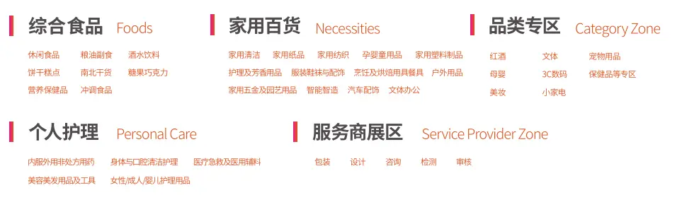 日用百货类:日化用品、家具用品、餐厨用品、卫浴用品、文体用品、针织家纺、小家电、服装鞋帽、箱包皮具、宠物用品、玩具类、一次性用品、DIY用品等