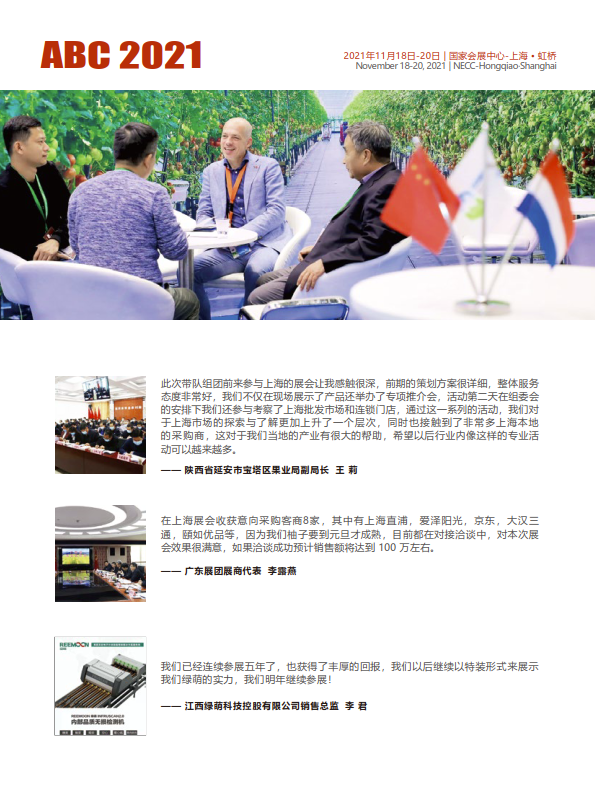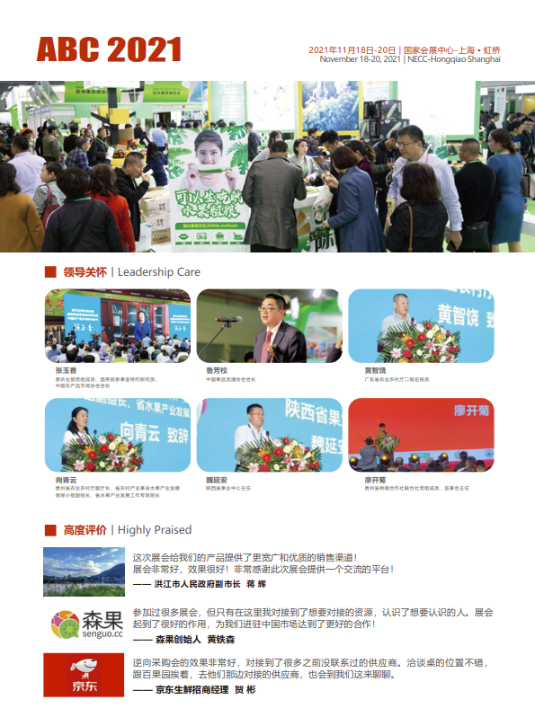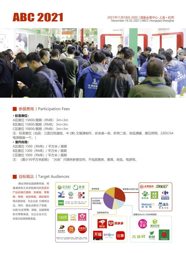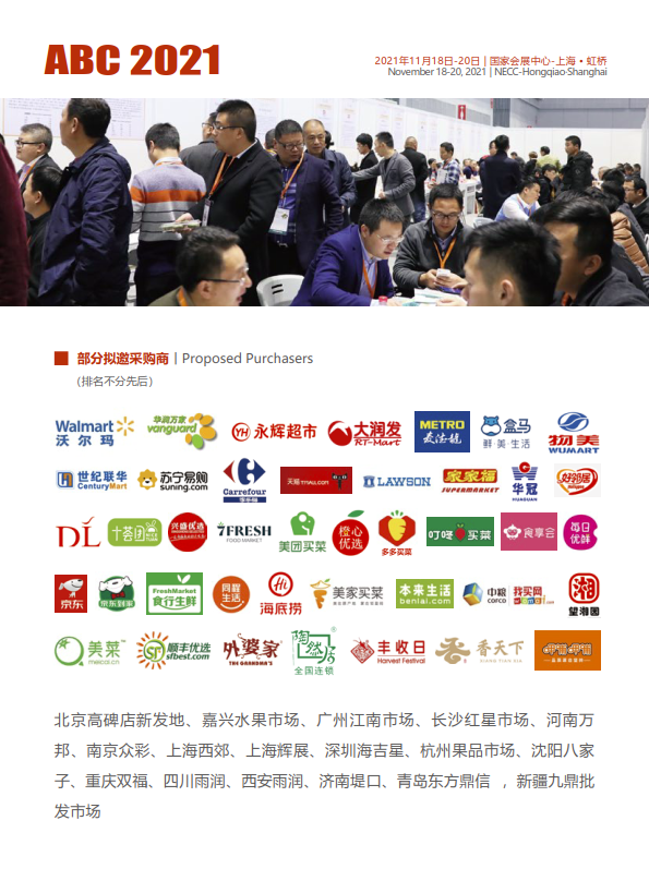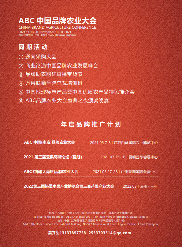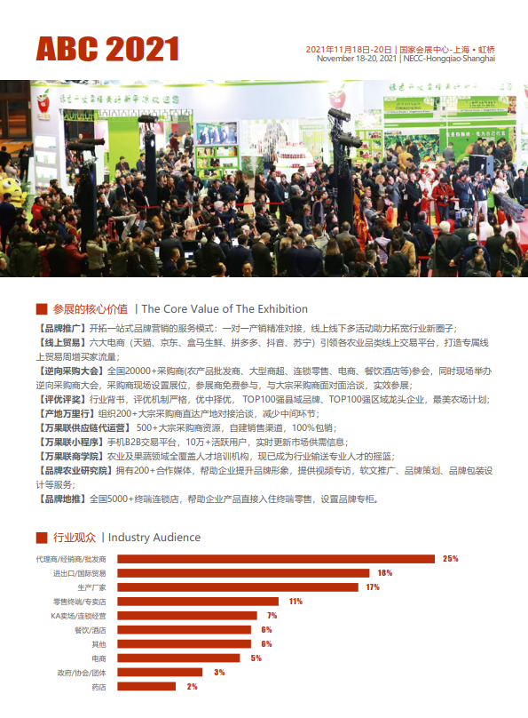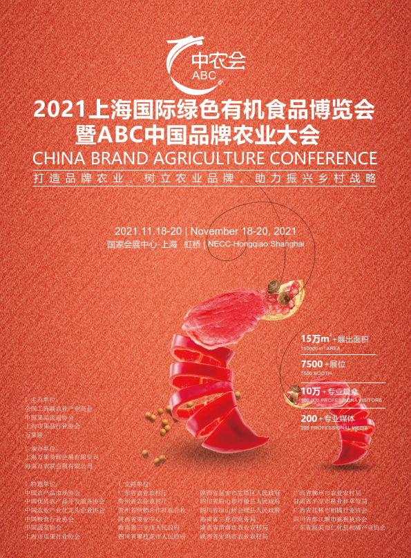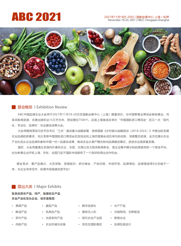 ABC中国品牌农业大会将于2021年11月18-20日在国家会展中心(上海)隆重举办,与中国零售业博览会联袂展出,共 享采购商资源,总展出面积达15万平方米,预设展位7500个。这是上海继成功举办“中国国际进口博览会”后又一次“现代 化、专业化、品牌化”农业建设成果大会。