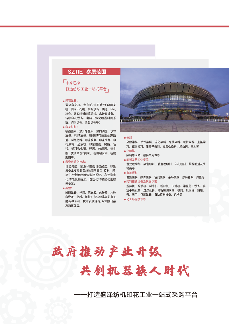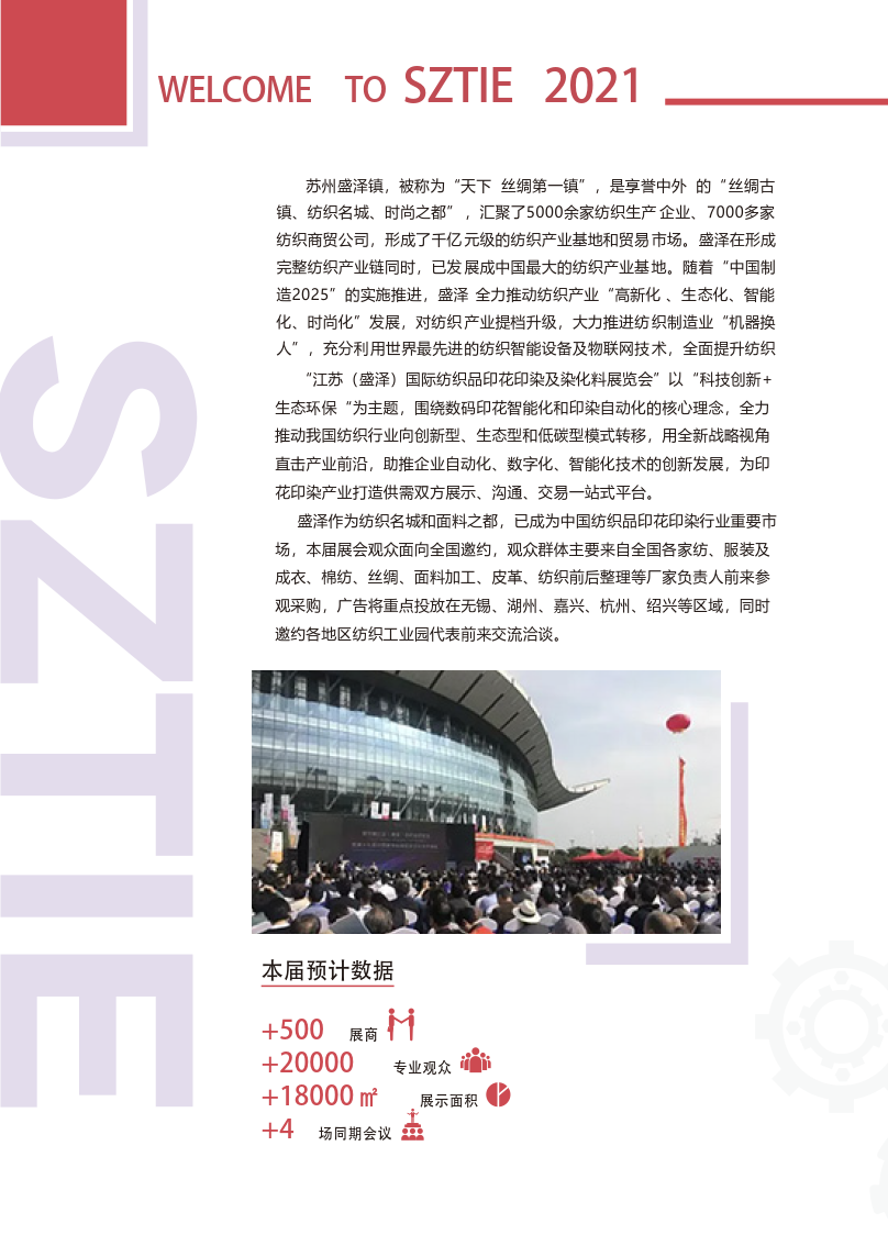 “江苏(盛泽)国际纺织品印花印染及染化料展览会”以“科技创新+ 生态环保“为主题,围绕数码印花智能化和印染自动化的核心理念,全力 推动我国纺织行业向创新型、生态型和低碳型模式转移,用全新战略视角 直击产业前沿,助推企业自动化、数字化、智能化技术的创新发展,为印 花印染产业打造供需双方展示、沟通、交易一站式平台。